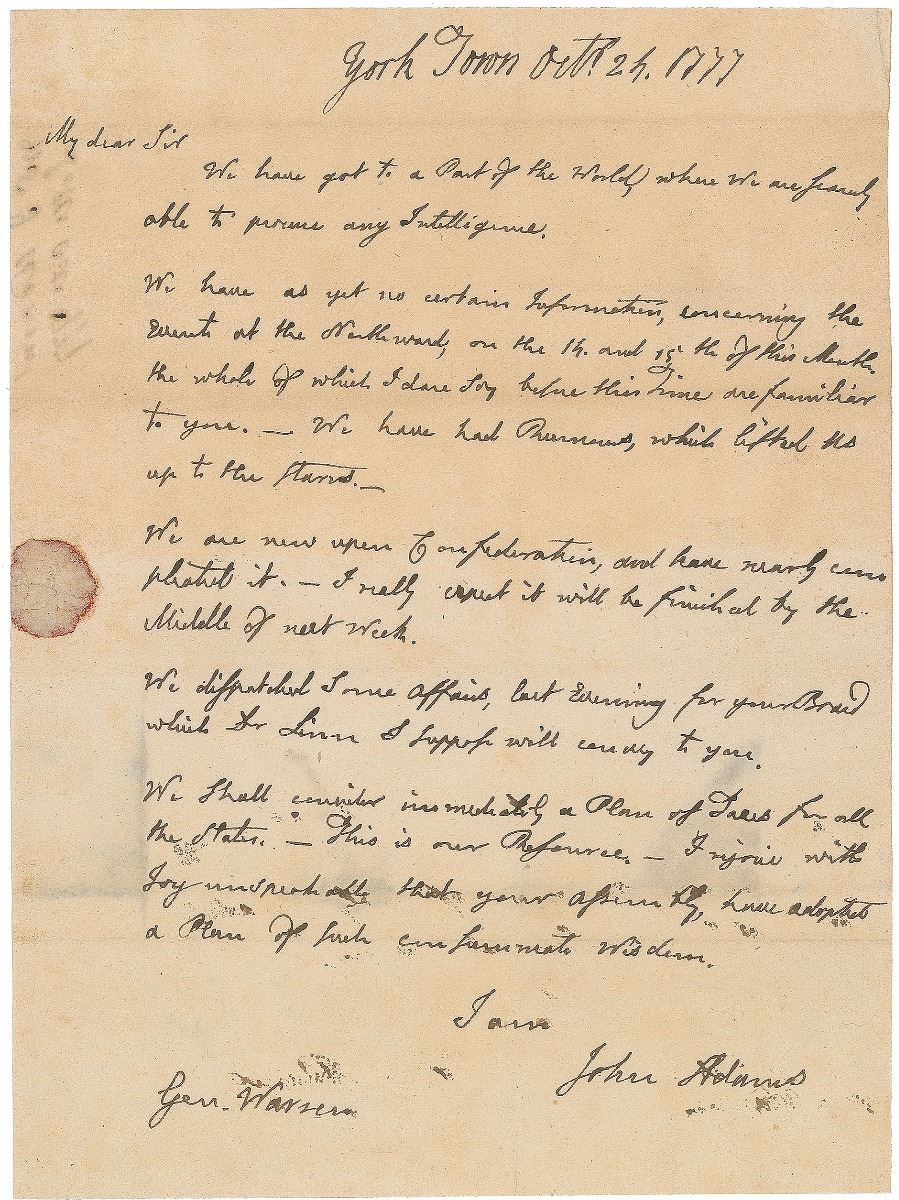Revolutionary War–dated ALS, one page, 7 x 9.5, October 24, 1777. Letter to General James Warren, written from Yorktown. In full: “We have got to a Part of the World, where We are scarcely able to procure any Intelligence. We have as yet no certain Information, concerning the events at the Northward, on the 14. and 15th. of this Month, the whole of which I dare say before this Time are familiar to you.—We have had Rumours, which lifted us up to the Stars.—We are now upon Confederation, and have nearly compleated it.—I really expect it will be finished by the Middle of next Week. We dispatched some Affairs, last Evening for your Board which Dr. Linn I suppose will convey to you. We shall consider immediately a Plan of Taxes for all the States.—This is our Resource.—I rejoice with Joy unspeakable that your Assembly, have adopted a Plan of such consummate Wisdom.” In fine condition. This letter is published in the Warren-Adams Letters, a collection of correspondence between John Adams, Samuel Adams, and James Warren.