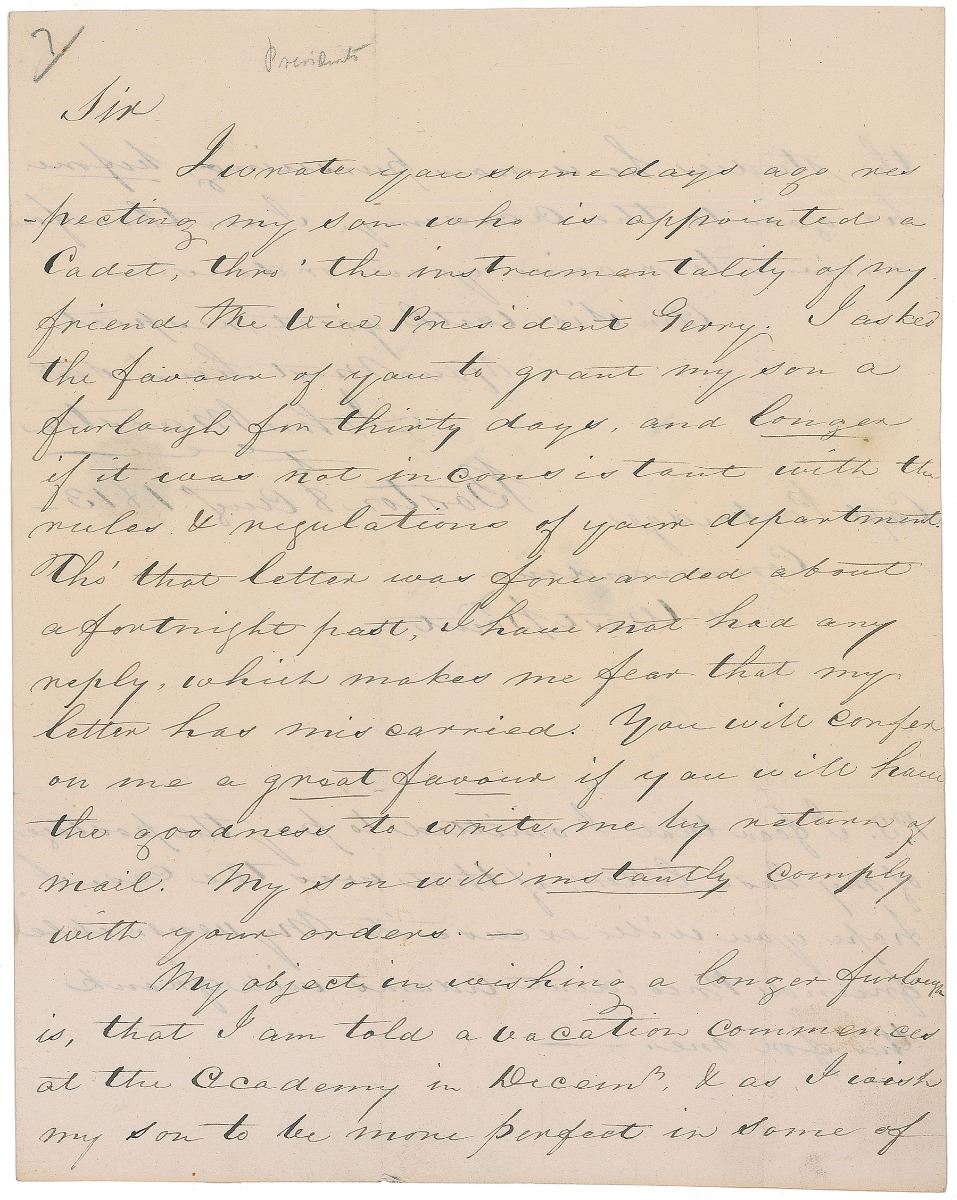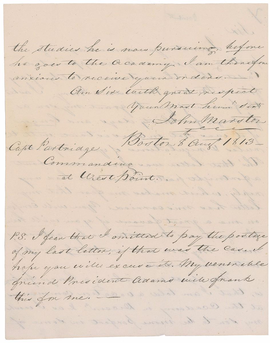 Full free frank, measuring 9.75 x 7.75 unfolded with a 5 x 3.25 center panel, addressed in another hand to “Capt Partridge at the Military Academy, West Point, State of New York,” franked in the upper right by Adams, “Free,” and signed on the left side, “J. Adams.” The original adjoining letter remains attached, written by “John Marston,” August 8, 1813, requesting a thirty day furlough for his son, Ward Marston, recently commission to be a cadet at West Point, reasoning, “I wish my son to be more perfect in some of the studies he is now pursuing, before he goes to the academy.” He writes that he had forwarded a letter through Vice President Elbridge Gerry two weeks earlier and had received no response, adding, “I fear that I omitted to pay the postage of my last letter…My venerable friend President Adams will frank this for me.” In fine condition, with seal-related paper loss on the integral address sheet. Marston again relied on Adams in 1818, sending a letter to say that his son failed a mathematics test and was thus not promoted after four years at West Point, again hoping that Adams may intercede on his behalf. A fantastic piece revealing the relationships and patronage that informed the politics of early America.