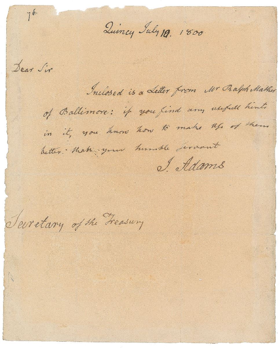 Scarce ALS as president signed “J. Adams,” one page, 8 x 10, July 10, 1800. Boldly penned letter to the “Secretary of the Treasury,” Oliver Wolcott, Jr. In full: “Inclosed is a Letter from Mr. Ralph Mather of Baltimore: it if you find any usefull hints in it, you know how to make use of them better than your humble servant.” In fine condition, with light edge chipping and a faint block of toning. The letter by Ralph Mather which Adams forwarded was presumably that of June 18, 1800, a lengthy missive in which Mather offered advice on international trade. In that letter, Mather pitched his services to the fledgling nation in the area of procurement and imports, describing the status of America’s overseas trade in language that continues to resonate in today’s politics.
