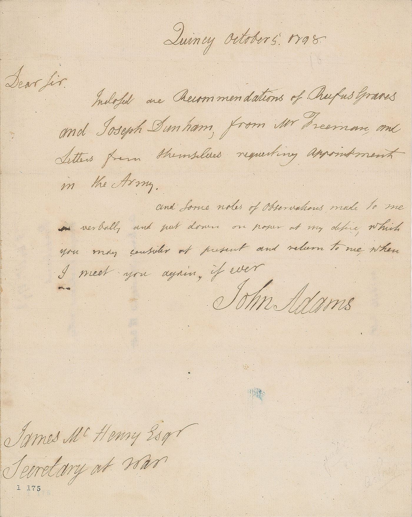 Crisply penned ALS as president, one page, 7.75 x 10, October 5, 1798. Letter to Secretary of War James McHenry. In full: "Inclosed are Recommendations of Rufus Graves and Joseph Dunham, from Mr. Freeman, and Letters from themselves requesting appointments in the Army. And some notes of observations made to me verbally and put down on paper at my desire, which you may consider at present and return to me when I meet you again, if ever." In fine condition. During this period, Adams and McHenry were working on building up the American armed forces in anticipation of a war with France. An excellent letter boasting a large, bold signature.