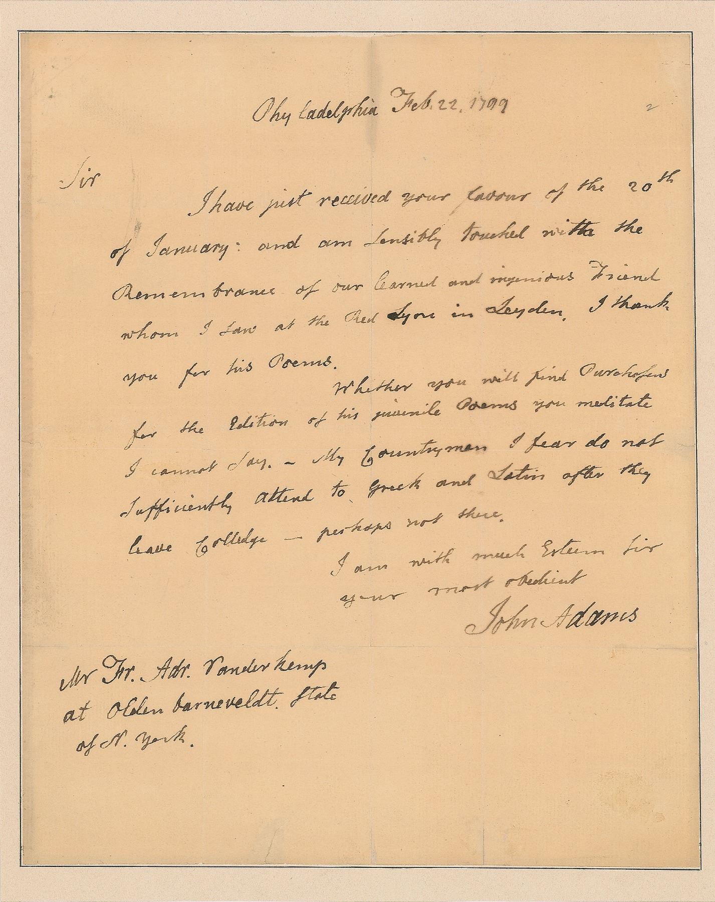 ALS as president, one page, 8 x 9.75, February 22, 1799. Letter to Dutch radical leader and Mennonite minister Francois Adriaan Van der Kemp in New York, in full: "I have just received your favour of the 20th of January: and am sensibly touched with the Remembrance of our learned & ingenious Friend whom I saw at the Red Lyon in Leyden. I thank you for his poems. Whether you will find Purchasers for the Edition of his juvenile Poems you meditate I cannot say.—My Countrymen I fear do not sufficiently attend to Greek & Latin after they leave Colledge—perhaps not there." Professionally inlaid into a slightly larger sheet. In fine condition, with slight splitting along intersecting folds.