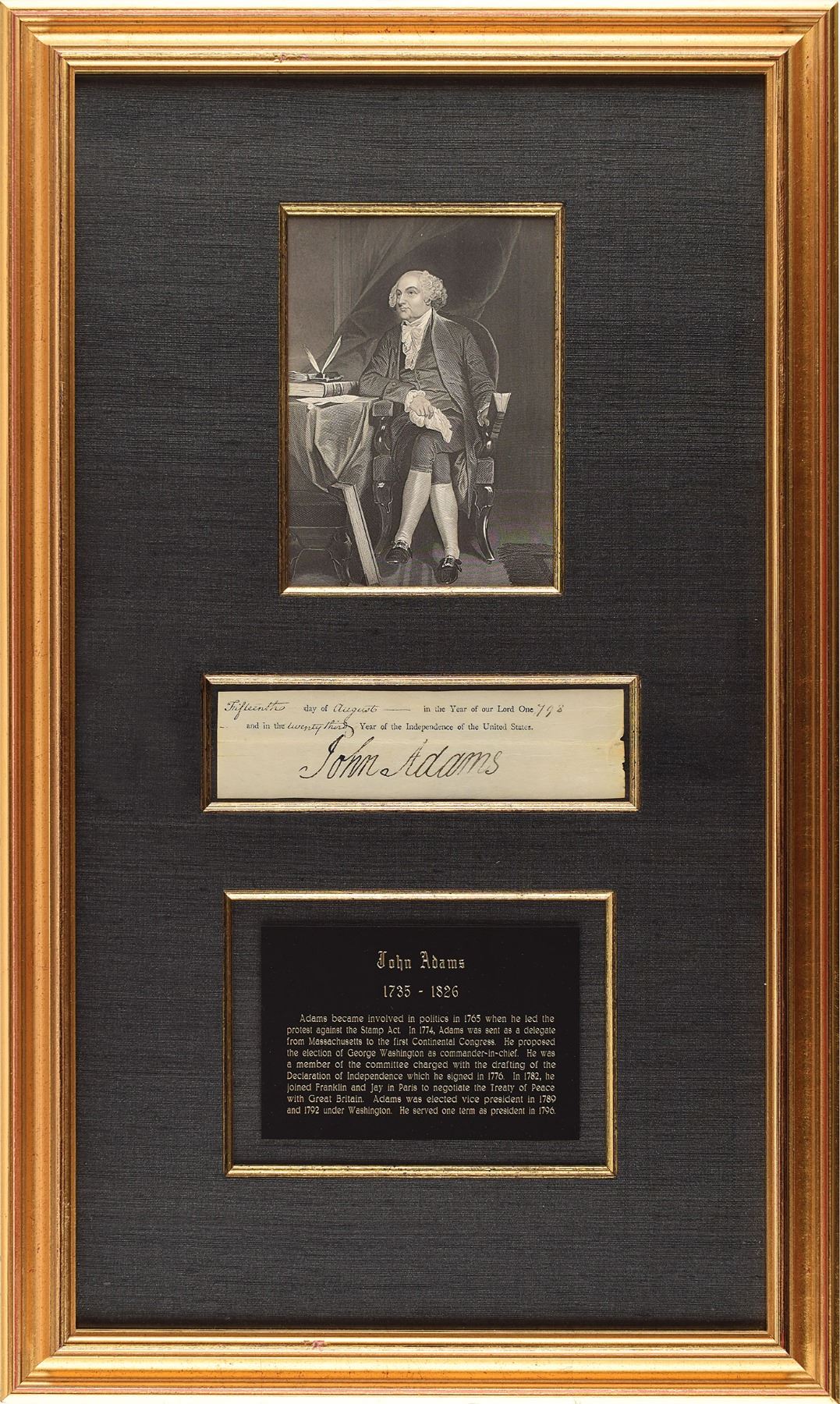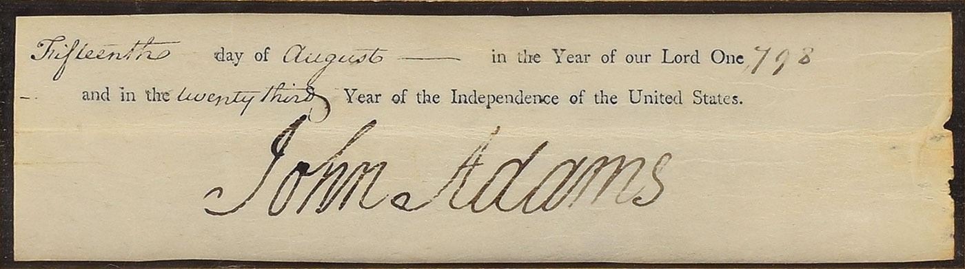 Remarkably large and crisp ink signature as president, "John Adams,” on an off-white 7.5 x 2 sheet clipped from the close of a document dated to August 15, 1798. Attractively cloth-matted and framed with a plaque and engraving to an overall size of 16 x 26.25. In fine condition, with some light creasing. Measuring nearly 4–inches in length, this represents one of the largest John Adams signatures we have offered, an example made all the more desirable by its boldness and by the significance of the time period—animosity between America and France in the wake of the recent recent XYZ Affair was soon to manifest in the Quasi War.