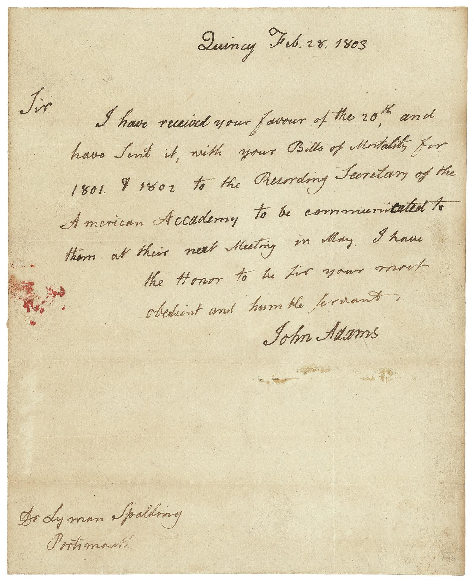 ALS, one page, 8 x 9.75, Quincy, Massachusetts, February 28, 1803. Letter to Lyman Spalding. In full: “I have received your favour of the 20th, and have sent it, with your Bills of Mortality for 1801 & 1802 to the Recording Secretary of the American Academy to be communicated to them at their next meeting in may. I have the honour to be sir your most obedient and humble servant.” In very good to fine condition, with intersecting mailing folds, one through a single letter of signature, some scattered light toning and soiling, and red wax seal remnants to left edge. Accompanied by the aforementioned Bills of Mortality for Portsmouth, New Hampshire listing 100 deaths in 1801 and 152 deaths in 1802 (lightly soiled and creased, with paper loss to edges of the 1801 document).