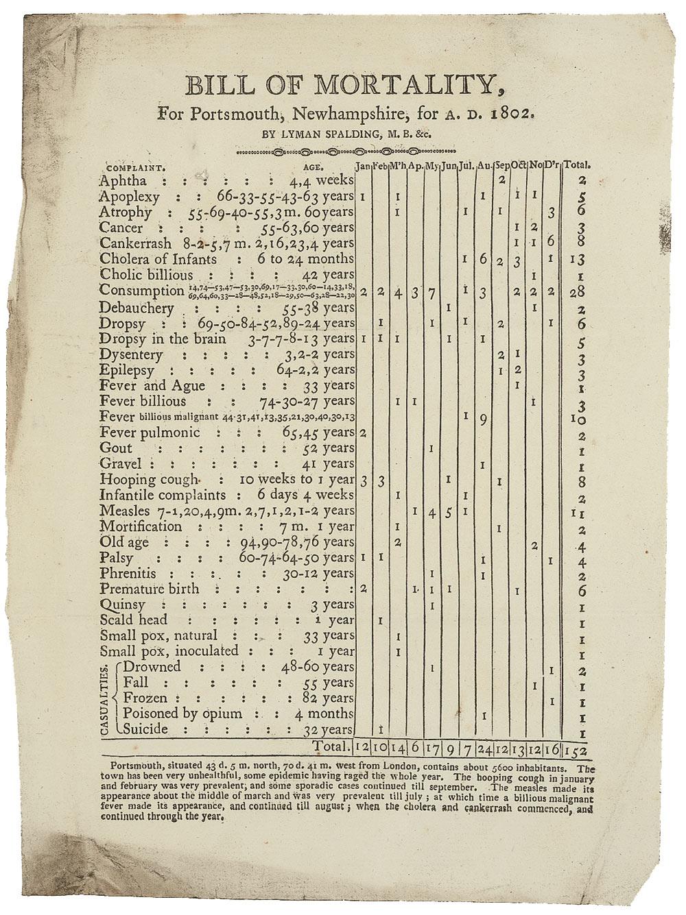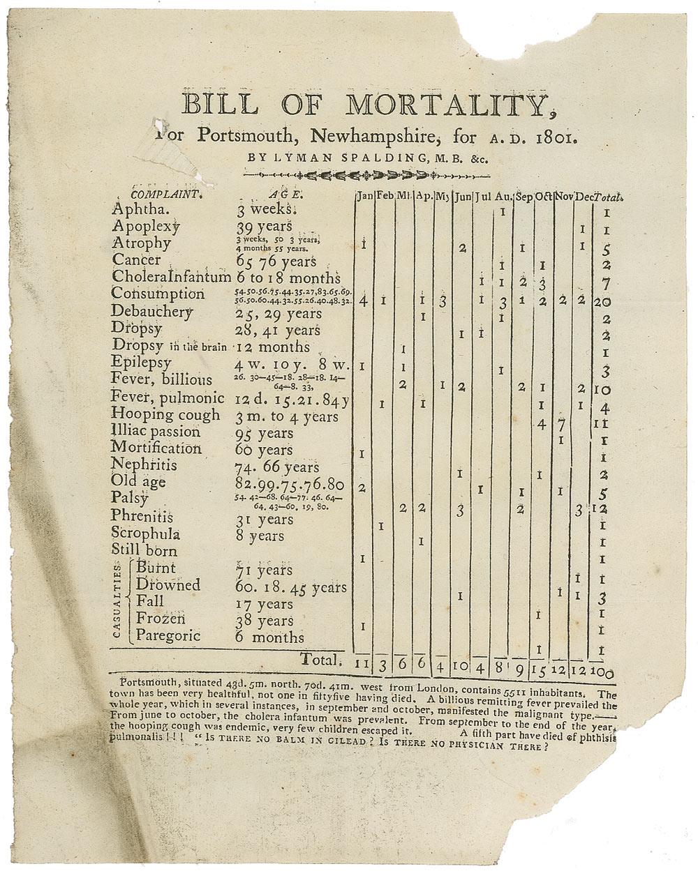 Spalding was a physician, noted for his work in smallpox vaccination, the treatment of yellow fever, and the study of anatomy, as well as for founding the Pharmacopoeia of the United States of America. In the early 1800s, as deaths from consumption were rising at an alarming rate, Spalding, who also founded the Dartmouth Medical School, began tabulating all passings occurring in Portsmouth and comprising the aforementioned Bill of Mortaility. The broadsides showed the the number of inhabitants, deaths, age, disease, and causes of death, was printed in 1801, and continued for eleven years during which period they were sent to prominent personages in the United States and in Europe. Among the recipients of Spalding’s research were then-president Thomas Jefferson and former president John Adams. Pre-certified John Reznikoff/PSA/DNA and RRAuction COA.
