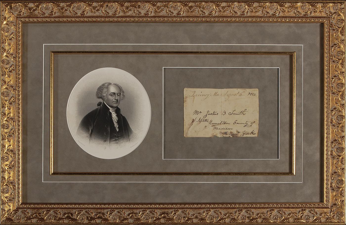 Free franked address panel, addressed in another hand to “Mr. Justus B. Smith, Hamilton county of Madison, New York.” In the upper right corner Adams has franked it, “Free,” then signed near the lower left, “J. Adams.” Also along the top is written “Quincy, Ms. August 6th.” Triple suede matted and framed with an engraved portrait of Adams, to an overall size of 22.5 x 15. A central vertical fold, a couple areas of minor paper loss near bottom, and scattered light toning and soiling, a bit lightly affecting Adams’s first initial, otherwise very good condition. Pre-certified John Reznikoff/PSA/DNA and RRAuction COA.
