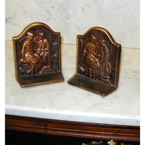 Pair of historical bookends - either cast iron or bronze with copper patina and hammered back. Copyright 1928 on back Has a symbol of circle and triangle on back also. While Priscilla is at the spinning wheel, John Alden is wooing her. Green felt on bottom. Minor loss of color due to age. Buyer pays shipping and handling costs.