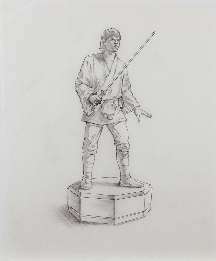 Design study drawing for the Danbury mint Limited Edition Star Wars pewter chess set. Accomplished in pencil on a 14 in. x 17 in. leaf of artist’s vellum featuring Luke Skywalker wielding his light saber. Signed “A” by artist John Alvin.