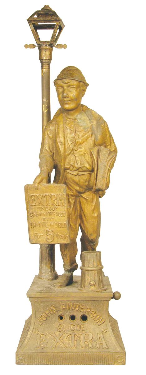 John Anderson & Company Cigar Tip Cutter and Lighter and match holder. Advertising Extra Fine Cut Chewing Tobacco for 5 cents. White metal with match strike base, depicting a newsboy. Good original condition. 6 X 19 X 7 inches.