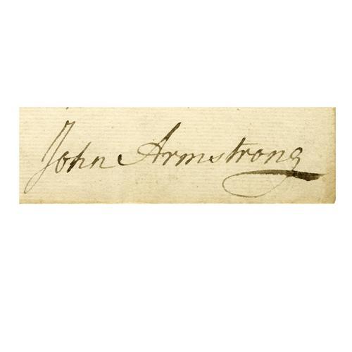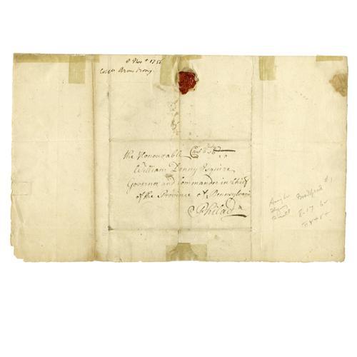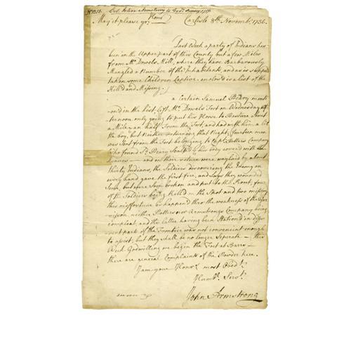 <B>Reporting on a deadly Indian raid in Pennsylvania in 1756</B></I> <B>John Armstrong (1725-1795) American General in the Revolutionary War, fine content Autograph Letter Signed</B></I> "<I>John Armstrong</B></I>", two pages with integral address leaf, 7.5" x 12", Carlisle, [Pennsylvania], November 8, 1756 to Pennsylvania Governor William Denny reporting of an Indian attack on Fort McDowell (near present-day Mercersburg, Pennsylvania). He writes in part: "<I>Last Week a party of Indians has been in the Upper part of this County but a few Miles from McDowels Mill, where they have Barbarously Mangled a Number of the Inhabitants, and as is supposed taken some Children Captive. enclose'd is a list of the Kill'd and Missing. A Certain Samuel Peary mention'd in the list, left McDowels Fort on Wednesday afternoon only going to put his Horse to Pasture about a Mile & an [sic] half From the Fort, and had with him a little boy, but Neither returning that Night; fourteen men was Sent from the Fort belonging to Capt. Potters Company who found Sd. Peary Scalp'd & his body covered with Leaves -- and on their returned were waylaid by about thirty Indians, the Soldiers discovering the enemy on every hand, gave the first fire, and Says they wounded Some, but were Soon broken and put to the rout, four of the soldiers being Kill'd on the Sport and two missing. this misfortune is happen'd thro the weakness of the garrison, neither Potters nor Armstrong's company being compleat [sic], and the latter been Station'd in different parts of the Frontier was not convenient enough to assist, but they shall be no longer Separate... there are general Complaints s of the Powder here...</B></I>" On the inside of the letter, a 4.5" x 10" manuscript has been attached listing the names of those killed or missing. Those killed included three soldiers and seven civilians. The missing included two soldiers as well as "<I>...Four children belonging to John Archer, Samuel Neely a boy [and] James McCoid a child</B></I>" Fort McDowell was constructed in 1755, one of numerous forts built along the Appalachian frontier to protect from raids by Indians allied with the French. The fort consisted of a rectangular stockade with four blockhouses that surrounded a gristmill. The fort was manned by about 40 militia until the competition of Fort Loudon several miles to the north. Fort Loudon would become an important post on the Forbes Road leading to Fort Pitt. Weak folds repaired with archival tape, else very good condition. Quite significant content. One has to wonder if the kidnapped children -- a common practice by several tribes -- were ever heard from again. From the Henry E. Luhrs Collection. Accompanied by LOA from PSA/DNA.