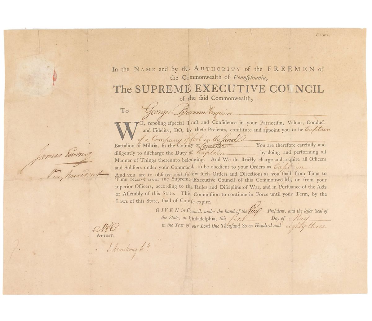 American soldier and statesman (1758–1843) who was a delegate to the Continental Congress, US Senator from New York, and Secretary of War. Partly-printed DS, signed “J. Armstrong, Jr.,” one page, 15 x 10.75, May 1, 1783. The Supreme Executive Council of Pennsylvania appoints George Bowman to be a “Captain of a Company of Foot in the Second Battalion of Militia, in the County of Lancaster.” Signed along the left side by council Vice President James Ewing, and at the bottom by Armstrong as the secretary of state. The front of the document has been professionally silked. Aforementioned silking, old repairs to the reverse of the intersecting folds, some scattered paper loss along or near folds, and scattered soiling and foxing, otherwise very good condition. The white paper seal, affixed to the upper left corner with red wax, is toned and worn.