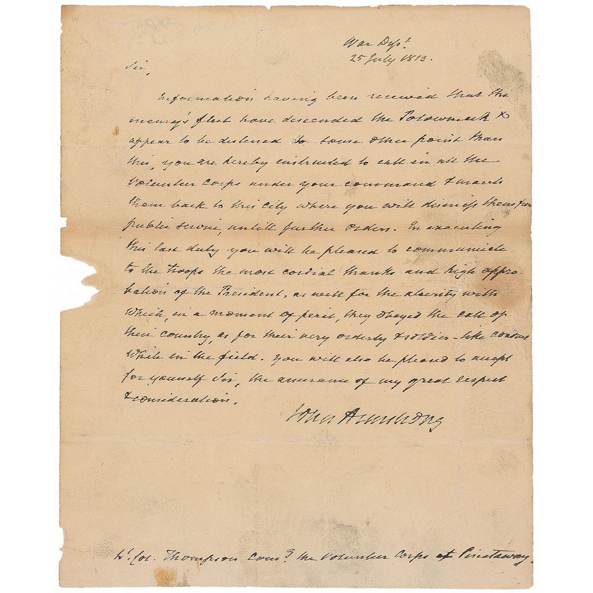 American soldier and statesman who was a delegate to the Continental Congress, US senator from New York, and secretary of war (1758–1843). War-dated ALS, one page, 7.75 x 9.75, July 25, 1813. Letter to Lt. Col. Thompson, commanding the Volunteer Troops at Piscataway. In part: “Information having been received that the enemy’s fleet have descended the Potowmack & appear to be destined to some other point than this, you are hereby instructed to call in all the volunteer corps under your command & march them back to this city where you will dismiss them from public service until further orders…You will be pleased to communicate to the troops the most cordial thanks and high approbation of the President, as well as for the alacrity with which in a moment of peril, they obeyed the call of their country, as for the very orderly & soldier-like conduct while in the field.” In very good condition, with intersecting folds (one vertical fold passing through a single letter of the signature) scattered staining and soiling, and some paper loss to left edge.
