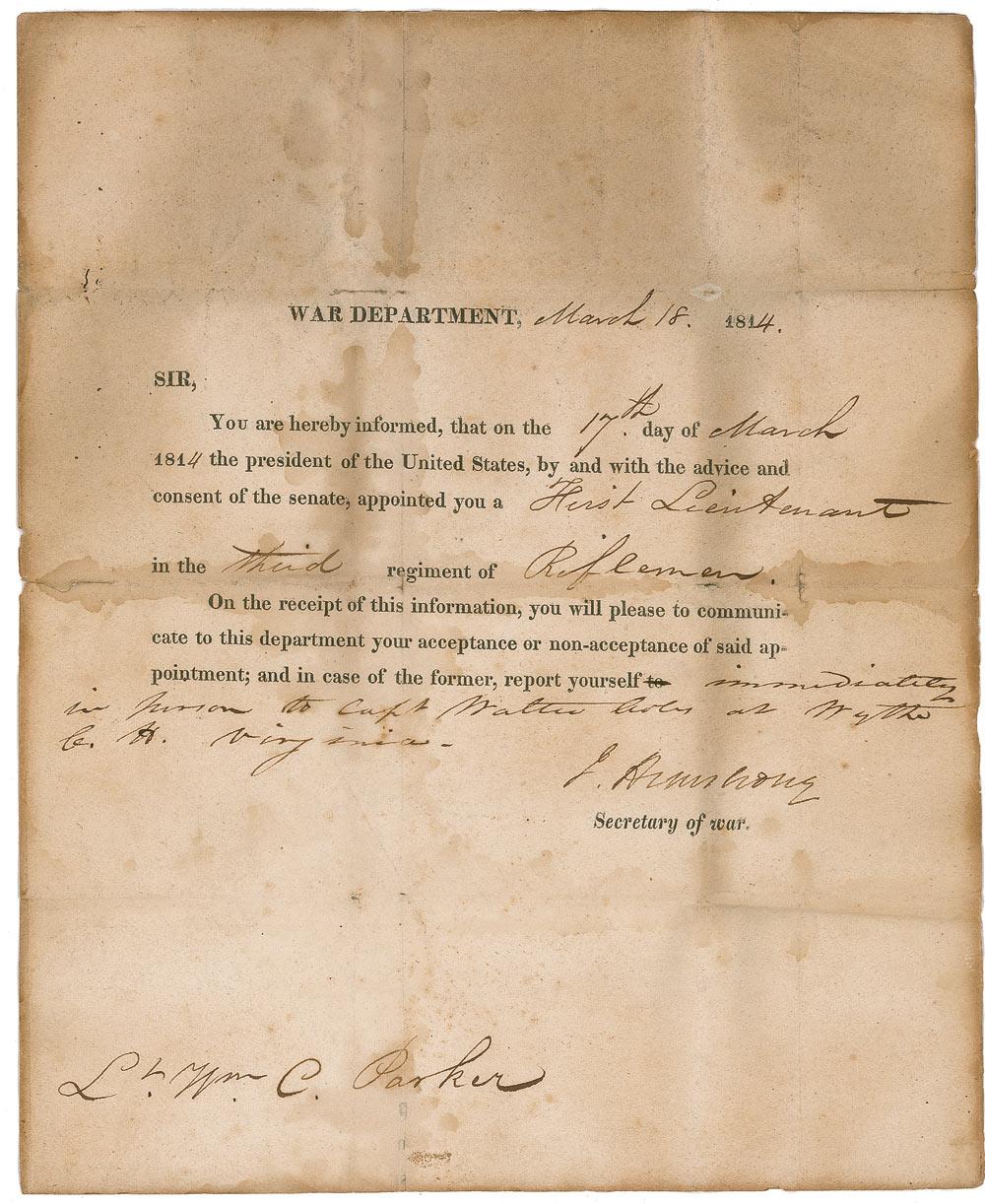Armstrong was a solider and statesman (1758–1843) who served as secretary of war under Madison. Walbach (1766–1857) was a career soldier in the US Army. War-dated partly-printed DS, signed “J. Armstrong,” one page, 7.75 x 9.75, March 18, 1814. Secretary of War Armstrong appoints William C. Parker a “First Lieutenant in the third regiment of Riflemen.” Signed at the conclusion by Armstrong. Second integral page bears a franking signature of Walbach. In good condition, with intersecting folds, one through a single letter of Armstrong’s signature, scattered moderate damp staining to both pages, several small areas of paper loss to both pages, and scattered creasing and wrinkling.