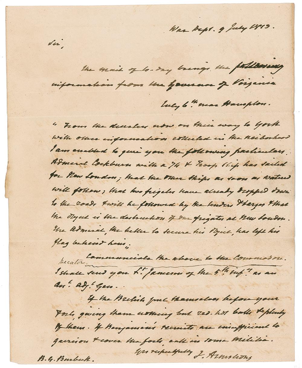 In this key letter to Burbeck, Secretary of War Armstrong cautions the Connecticut commander about the dastardly British Admiral George Cockburn, who had gained a reputation for ruthlessly attacking American shipping, disrupting commerce, and raiding ports. About two weeks before this missive was sent, Virginia’s governor reported, British landing parties assaulted Virginia and overwhelmed the militiamen protecting the outskirts of Hampton. In a shocking turn of events, British soldiers raped and murdered residents as well as stealing and destroying property. Information gathered from deserters indicated that British transports, under Cockburn’s command, were now sailing to New London, threatening the Connecticut port. “That the object is the destruction of our frigates at New London,” Armstrong warned...though the parties involved feared the carnage would not stop there. With this information from Armstrong and the governor in hand, Burbeck organized the state militia, and continued in command of New London until the end of the war. Historically significant correspondence during a decidedly volatile period of the war.