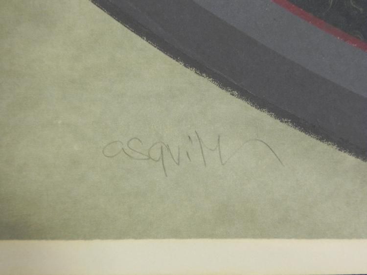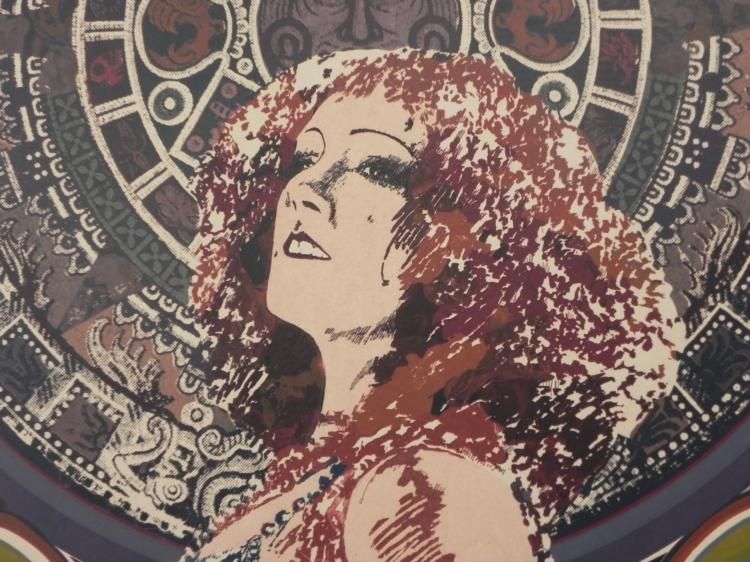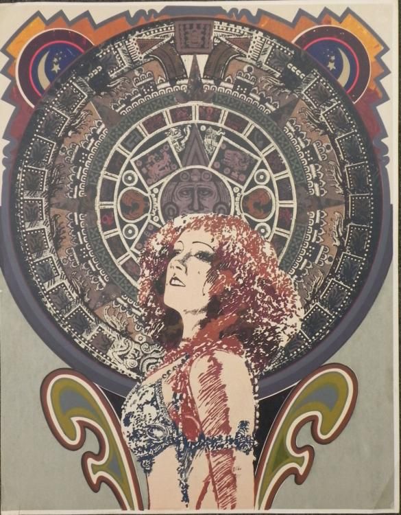This art print, done in the style of 1960's and 70's poster art, portrays a dazzling woman in front of a mysterious Aztek calendar. Signature: In pencil, lower right side Title: AztecaEdition: 55/60 Medium: Lithograph on paperSheet size: 22 x 28 inches Condition: Very good, with wear near the edges, and small edge tear