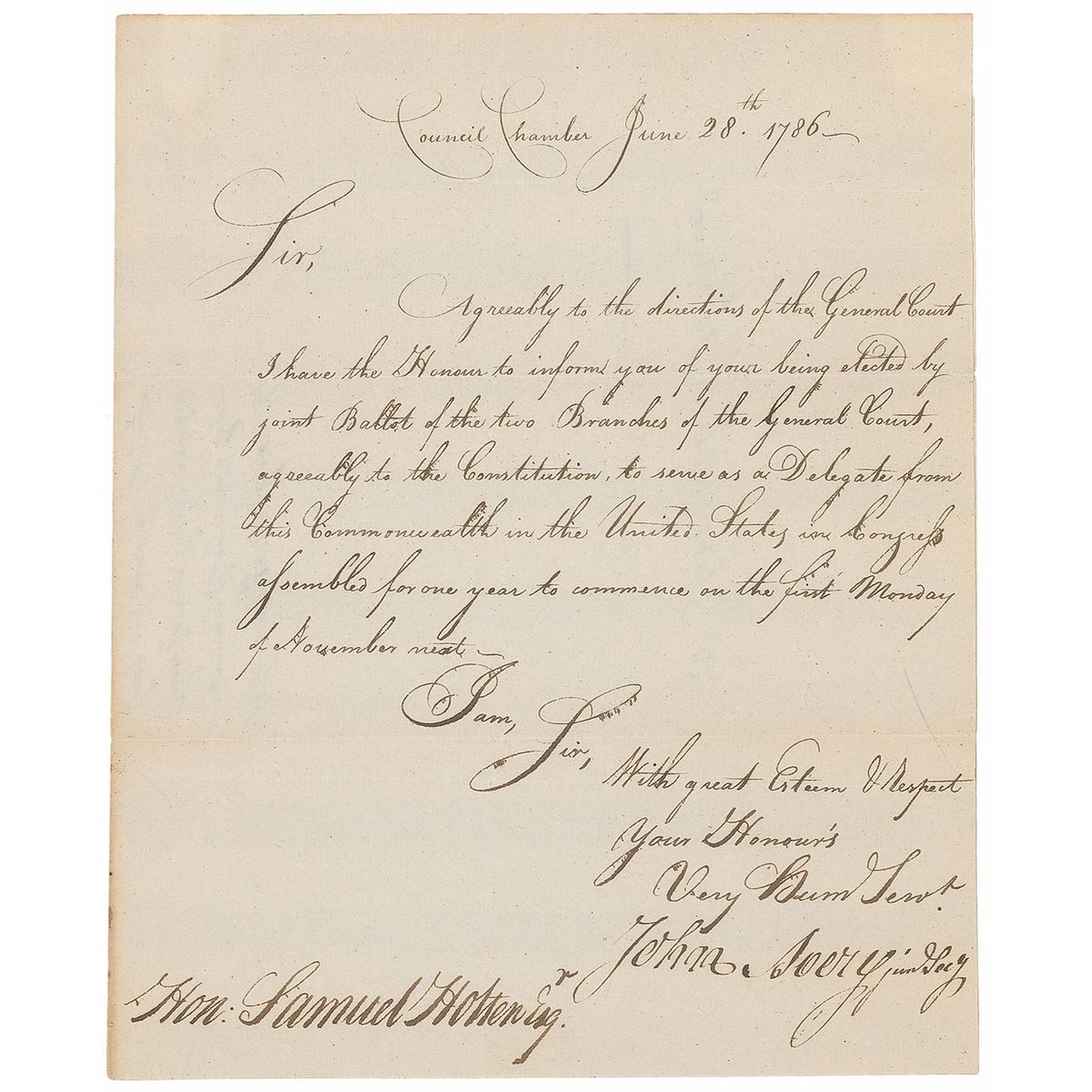 Early American politician (1739–1806) who served as the first Massachusetts Secretary of the Commonwealth. LS signed “John Avery, jun Sec’y,” one page, 7.25 x 8.75, June 28, 1786. Letter to Hon. Samuel Holten. In full: “Agreeably to the directions of the General Court I have the Honour to inform you of your being elected by joint Ballot of the two Branches of the General Court, agreeably to the Constitution, to serve as a Delegate from this Commonwealth in the United States in Congress assembled for one year to commence on the first Monday of November next.” In fine condition.
