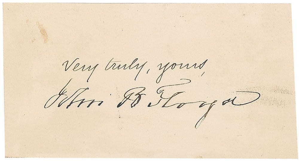 Confederate general and politician (1806–1863) who served as the 31st governor of Virginia and lost the crucial Battle of Fort Donelson. Ink signature, “John B. Floyd,” on an off-white 4 x 2 slip, beneath a brief sentiment in another hand. Slip is affixed to an identical size card. In fine condition, with some scattered light soiling and mounting remnants to reverse. Accompanied by an unsigned carte-de-visite.