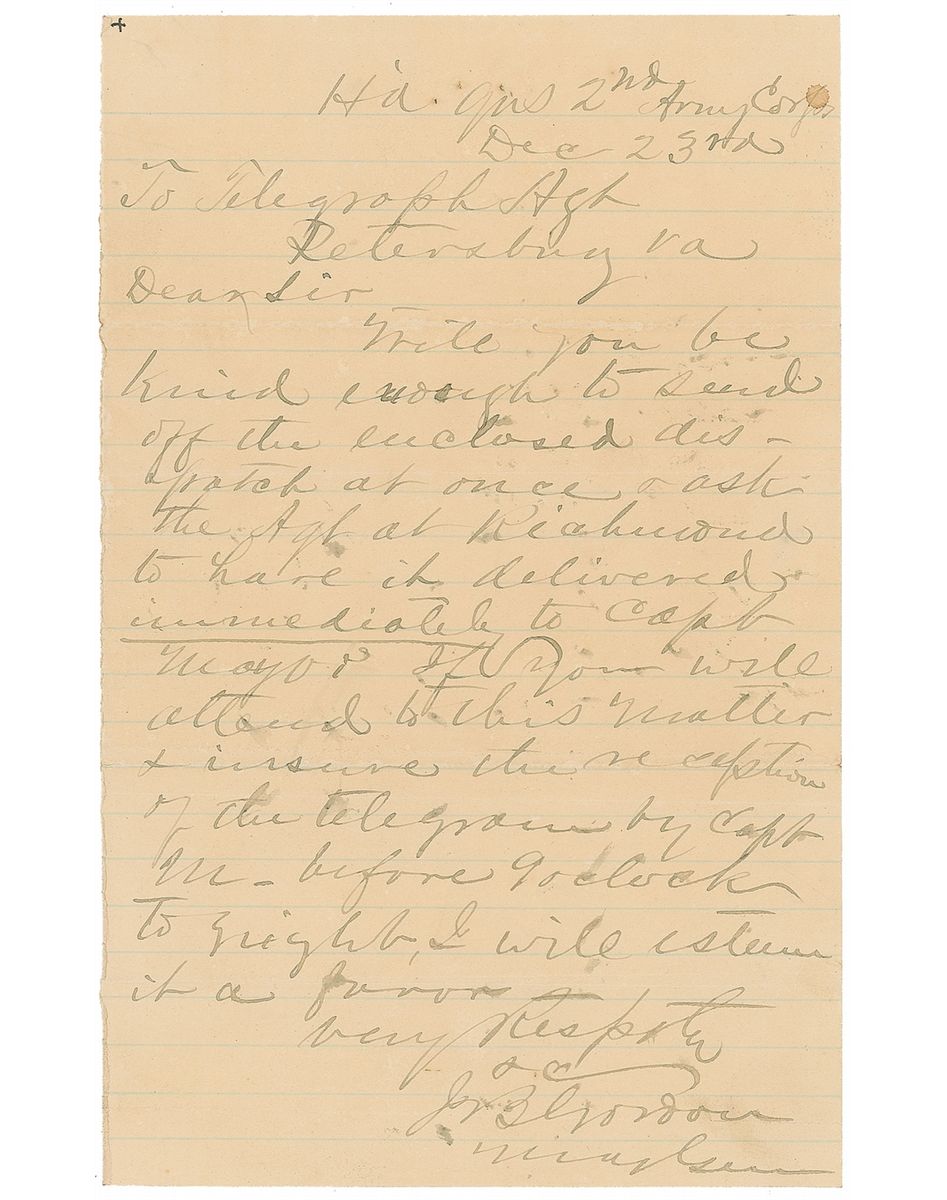 Confederate general (1832–1904) who surrendered Lee’s army to Union General Joshua Lawrence Chamberlain at Appomattox Courthouse. Civil War–dated ALS signed “J. B. Gordon, Maj. Gen.,” one page, lightly-lined, 5.25 x 8.25, Hd. Qrs. 2nd Army Corps, December 23, no year. Letter to a telegraph agent in Petersburg. In full: “Will you be kind enough to send off the enclosed dispatch at once & ask the agent at Richmond to have it delivered immediately to Capt. Mayo? If you will attend this matter & ensure the reception of the telegram by Capt. M. before 9 o’clock tonight, I will esteem it a favor.” In fine condition, with expected horizontal folds and some slight brushing to ink.