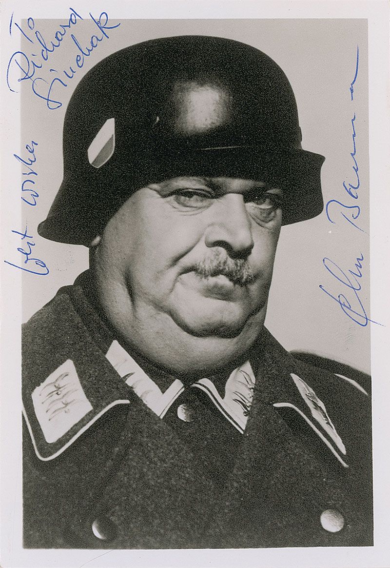 Matte-finish 5 x 7 photo of Banner as Sergeant Schultz, signed and inscribed in blue ballpoint, “To Richard Giuchak, best wishes, John Banner.” In fine condition.