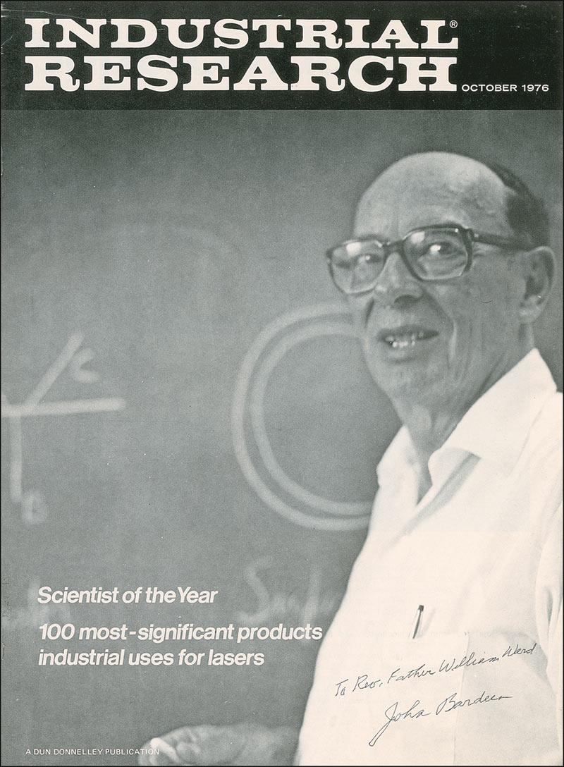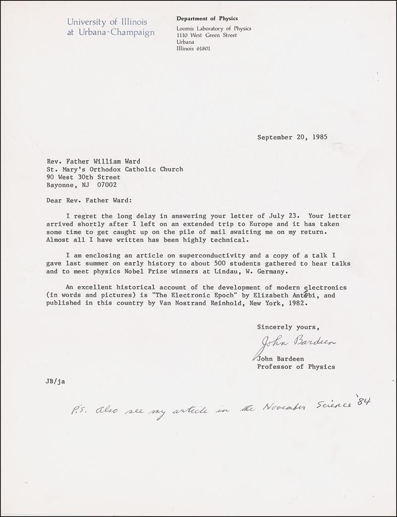 Physicist and electrical engineer (1908–1991) and the only person to have twice won the Nobel Prize in Physics, in 1956 and in 1972. Two items: one-page TLS, 8.5 x 11, University of Illinois at Urbana-Champaign letterhead, September 20, 1985, in reply to a letter. In part: “I am enclosing an article on superconductivity and a copy of a talk I gave last summer on early history to about 500 students gathered to hear talks and to meet physics Nobel Prize winners at Lindau, W. Germany.” He has added a postscript concerning another published article of his work; and an October 1976 copy of Industrial Research featuring the aforementioned article on superconductivity, signed and inscribed on the cover in black ballpoint, “To Rev. Father William Ward, John Bardeen.” In overall fine condition.