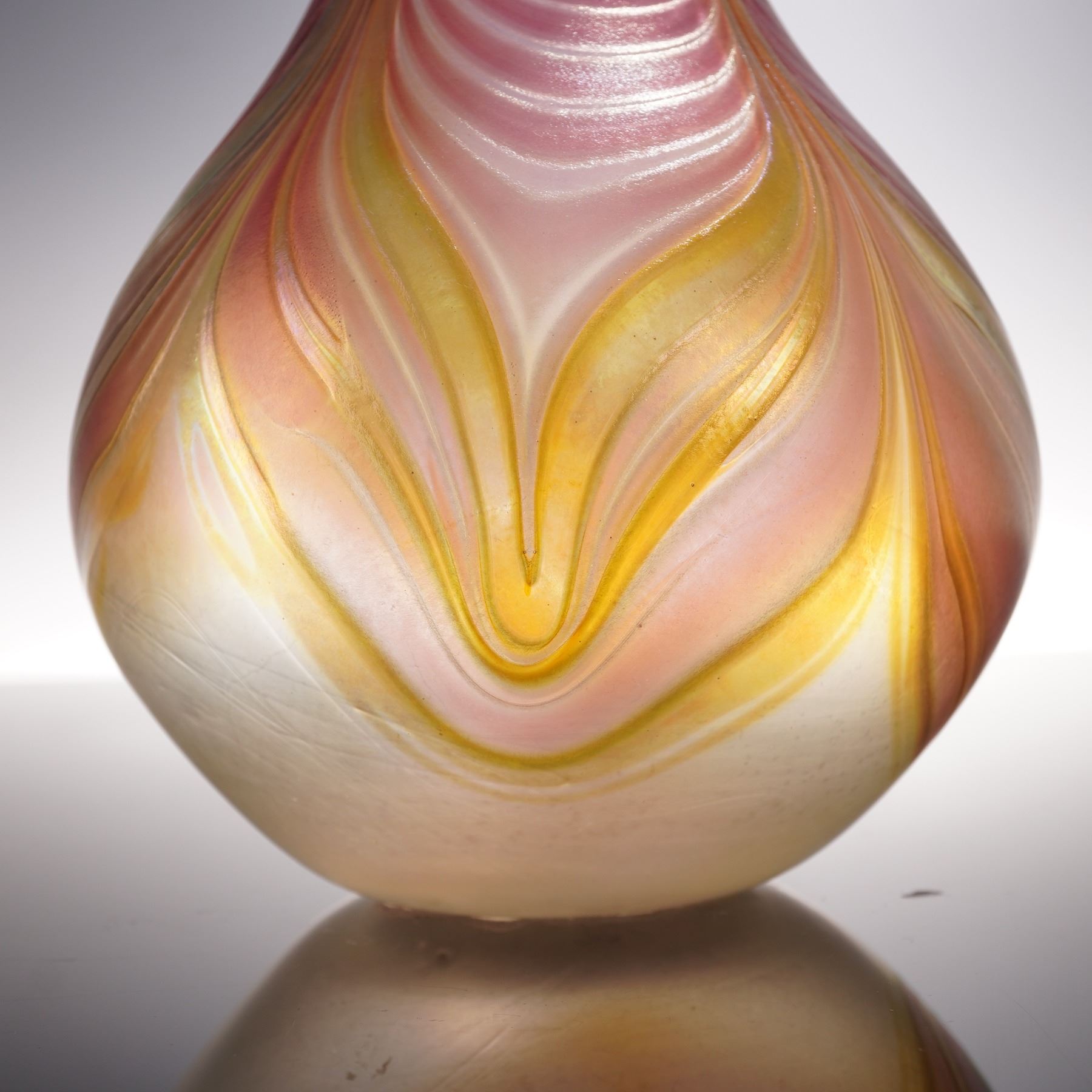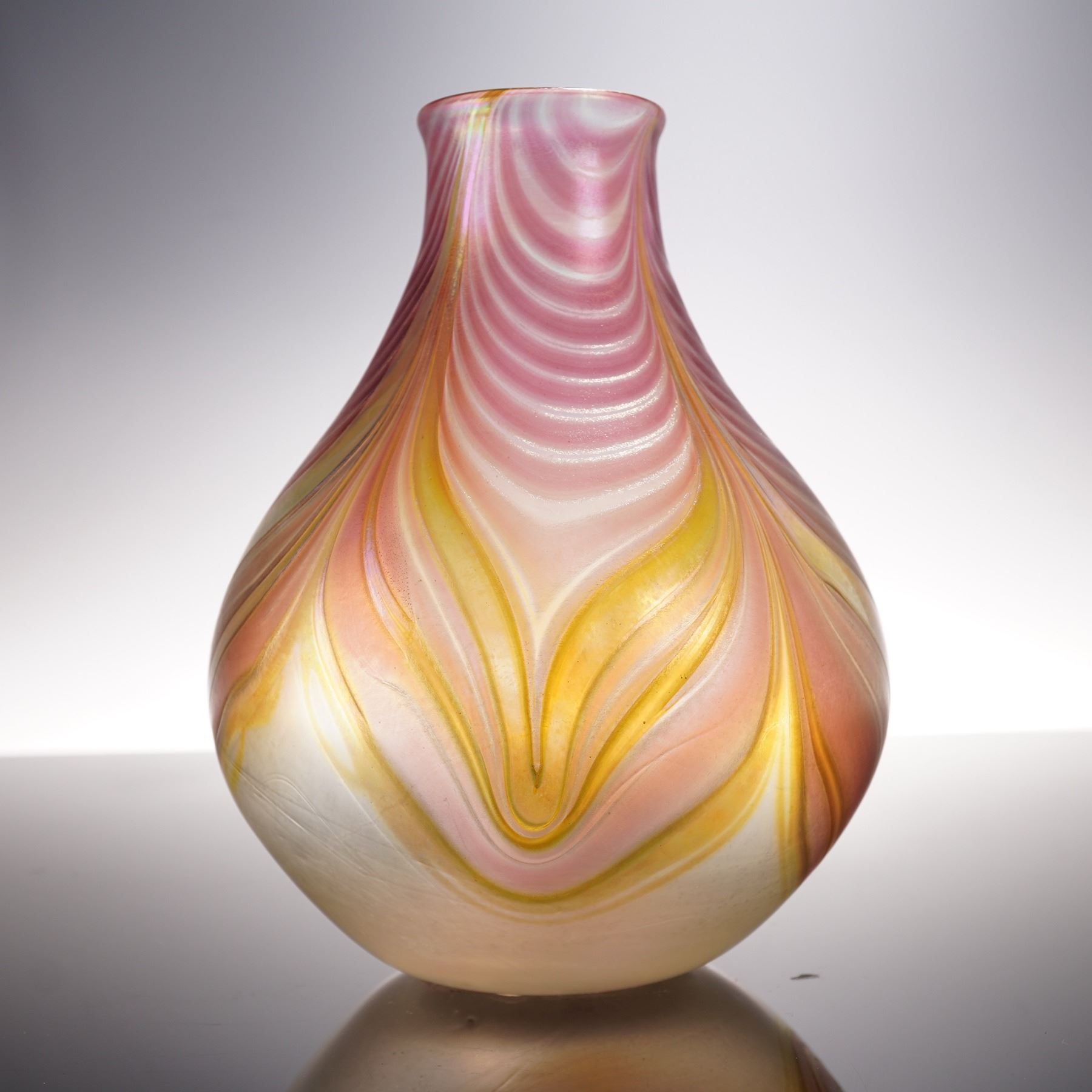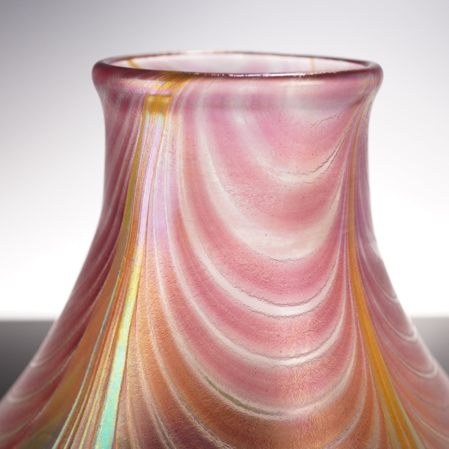 Striking studio art glass vase by John Barlin, dated 1993, featuring an iridescent finish with flowing feathered designs in pink, gold, and cream tones. The elegant teardrop form showcases Barlin's refined control of color and texture, producing a luminous, opalescent surface that shifts with the light. Signed and dated to the base, John Barlin 93.