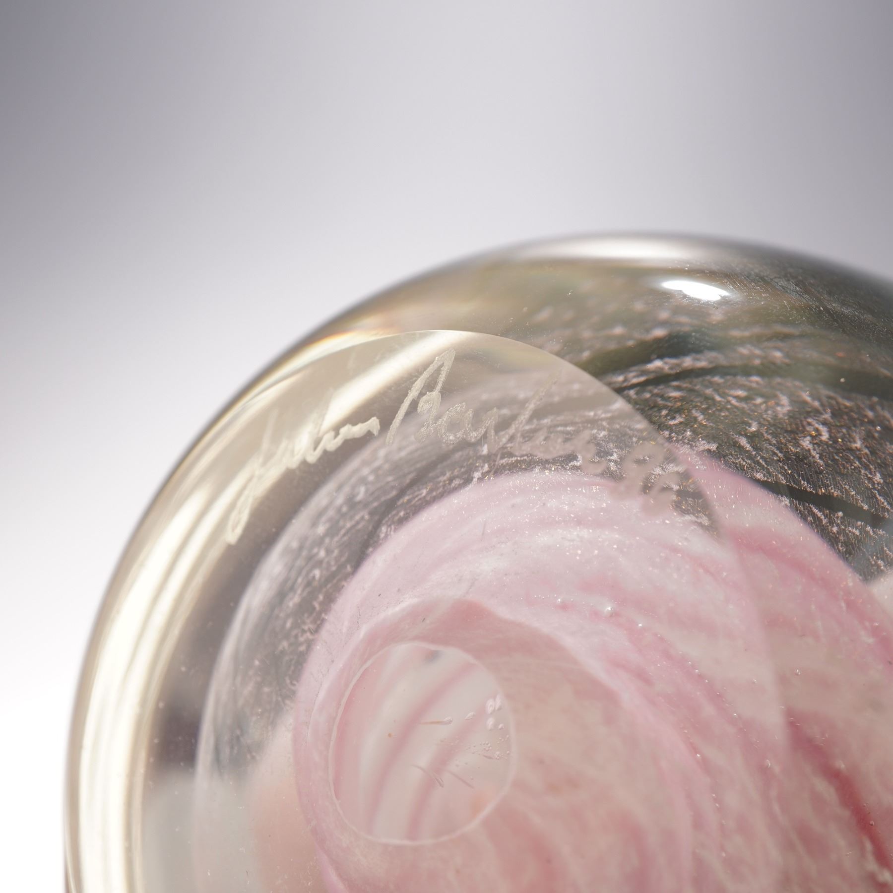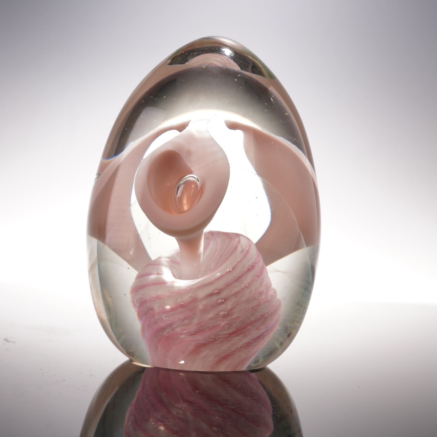 Contemporary studio art glass paperweight featuring a sculptural pink and white swirl encased within a clear glass dome. The piece displays a smooth, rounded form with polished surfaces that highlight the fluid internal design. Signed to the base by the artist John Barlin and dated 86', this elegant work showcases the beauty of hand-blown craftsmanship and makes a refined addition to any art glass collection.