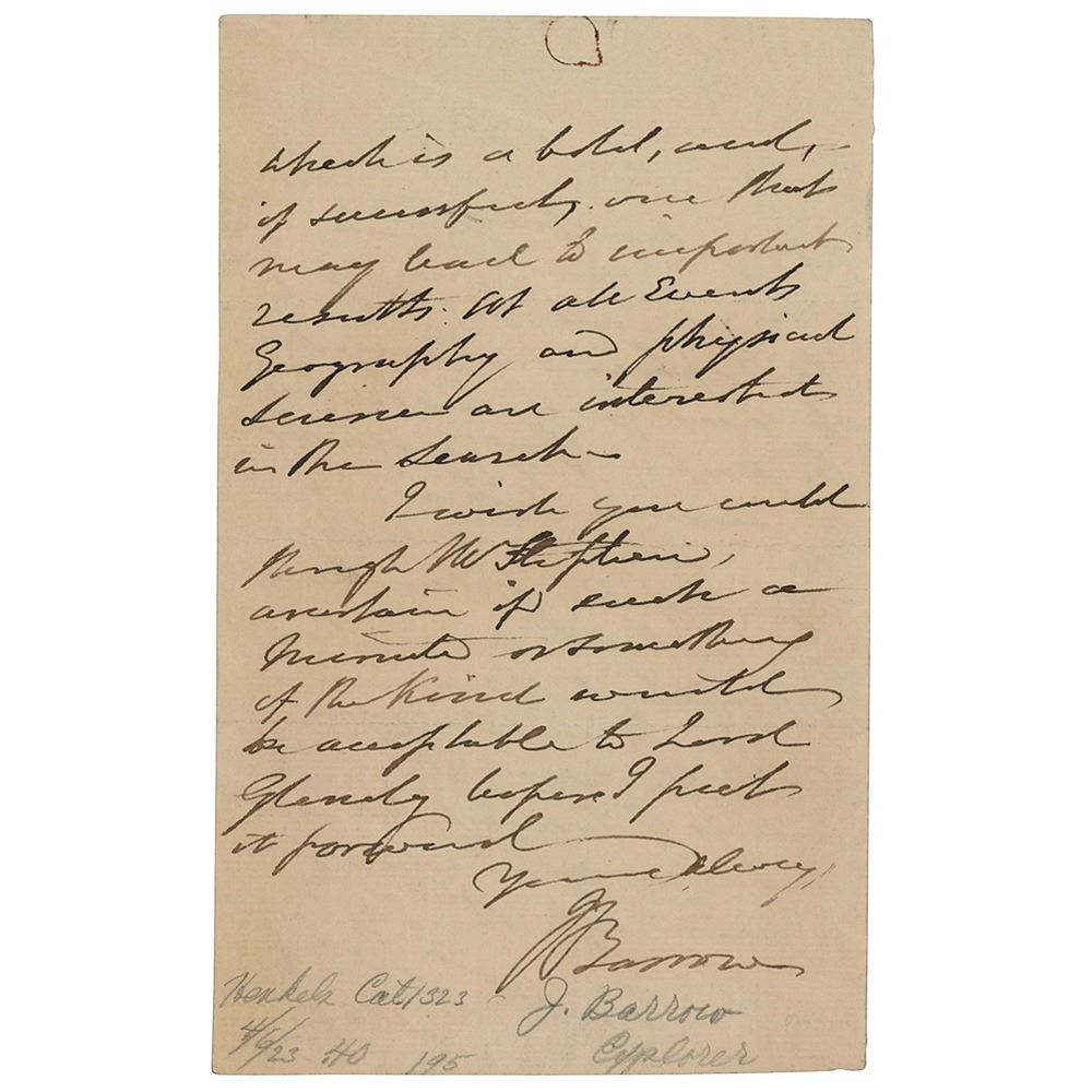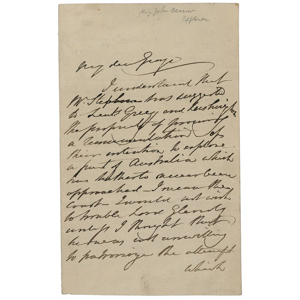 British naval administrator and explorer (1764-1848) who mapped the interior of South Africa and promoted the exploration of the Arctic; the Barrow Strait in northern Canada was named in his honor. ALS signed "J. Barrow," one page, 4.25 x 7, no date. Handwritten letter expressing a fellow explorer's "intention to explore a part of Australia which has hitherto never been approached," and soliciting support "to patronize the attempt which is a bold, and, if successful, one that may lead to important results." He adds: "At all events geography and physical science are interested in the search." In fine condition.
