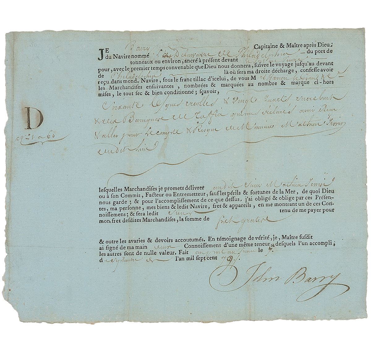 Irish-born sea captain (1745–1803) who commanded a number of American vessels during the Revolutionary War. Among other accomplishments, he successfully transported French gold across the Atlantic in order to fund the war effort, organized the crossing of the Delaware at Trenton in 1776, and forced a British surrender in the final naval engagement of the war. Partly-printed DS in French, one page, 9.25 x 7.5, September 1, 1779. Untranslated shipping license issued at Port-au-Prince, granted to Barry as captain of the Brig. Delaware of Philadelphia. In fine condition, with intersecting folds (one vertical fold passing through a single letter of the signature), light toning, and trivial paper loss to the lower left corner.