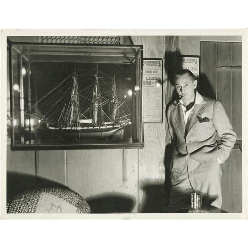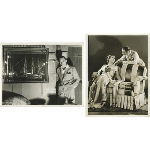<B>John Barrymore Photos.</B></I> "You have no idea what it means to play opposite so perfect an artist!" exclaimed Greta Garbo to John Barrymore after acting a scene with him in <I>Grand Hotel,</B></I> surprising Barrymore further by kissing him. Here are two superbly striking 11x14 stills of that "perfect artist," taken by Metro's ace portrait photographer Clarence Sinclair Bull during Barrymore's halcyon MGM years in the early 1930s. The horizontal portrait shows Barrymore posing by a ship model in the recreation room of his Beverly Hills house. He's smoking a pipe and standing in front of old framed theatre posters, which are visible on the wall behind him, along with his shadow. (There's also an empty glass on the table before him - reminding one of the Barrymore demons.) The second shot, vertical, shows Barrymore, flaunting his "Great Profile" as he poses with Diana Wynyard in MGM's <I>Reunion in Vienna</B></I> (1933). He's in uniform, and holding a glass here too, but it's evidently called for in the story. Each still has Bull's stamp on the verso. The portrait with pipe-and-ship model has the original snipe attached to the back and a Dell Publishing Company stamp, dated April 4, 1939 (although the still was taken circa 1932) and is in Excellent condition. The <I>Reunion in Vienna</B></I> picture has the original snipe on the back, as well as stamps from the <I>Photoplay</B></I> magazine library and blue pencil crop marks; there's a crease mark in the lower right corner, but it still rates Very Good condition. John Barrymore reigns as one of the most fascinating, eccentric and tragic Golden Age stars, and these two Bull portraits capture his flair and genius.