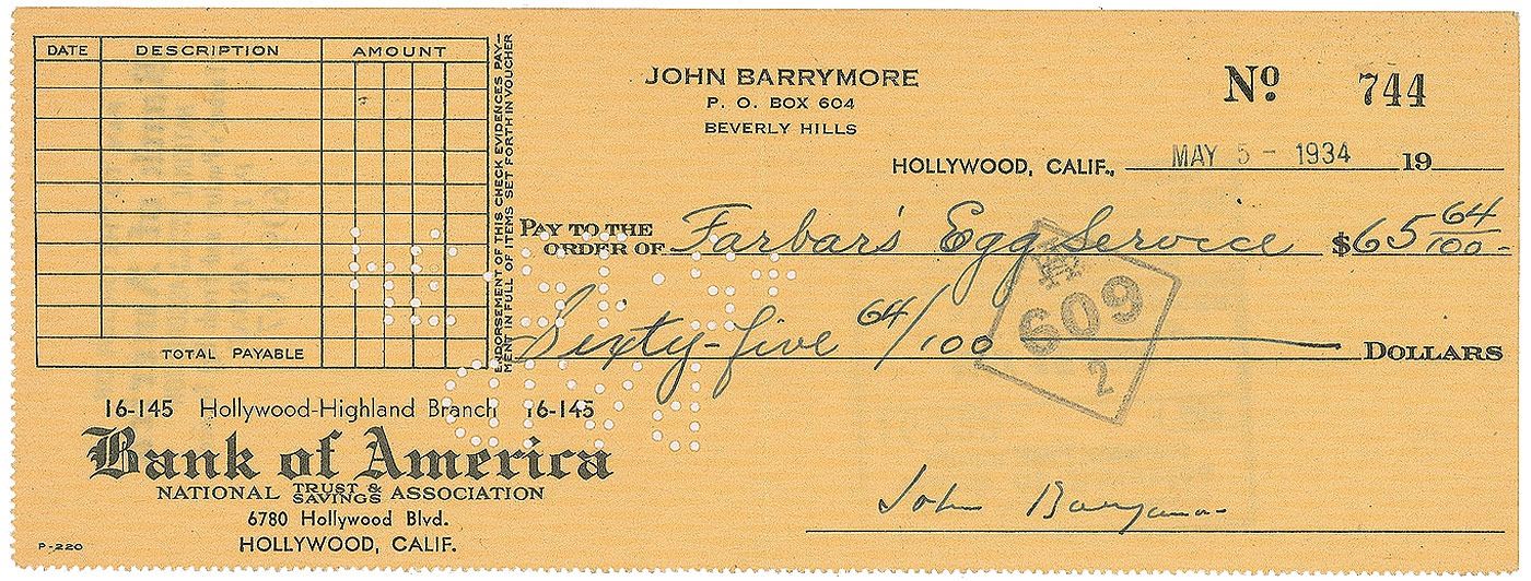 Personal check, 8.25 x 3, filled out in another hand and signed by Barrymore, "John Barrymore," payable to Farbar's Egg Service for $65.64, stamp-dated May 5, 1934. In fine condition, with a central vertical fold.