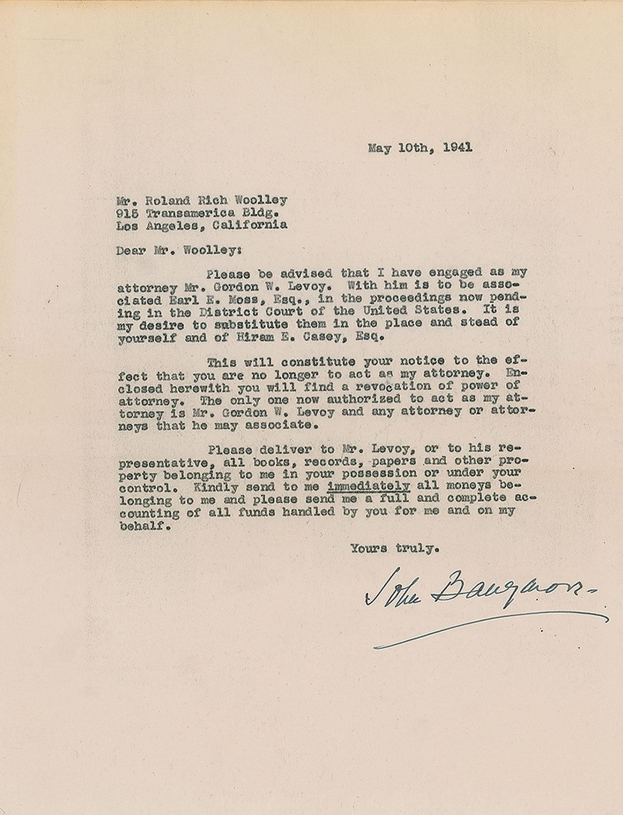 TLS, one page, 8.5 x 11, May 10, 1941. Letter to Roland Rich Woolley, in part: "Please be advised that I have engaged as my attorney Mr. Gordon W. Levoy. With him is to be associated Earl E. Moss, Esq., in the proceedings now pending in the District Court of the United States. It is my desire to substitute them in the place and stead of yourself and of Hiram E. Casey, Esq. This will constitute your notice to the effect that you are no longer to act as my attorney." In fine condition.