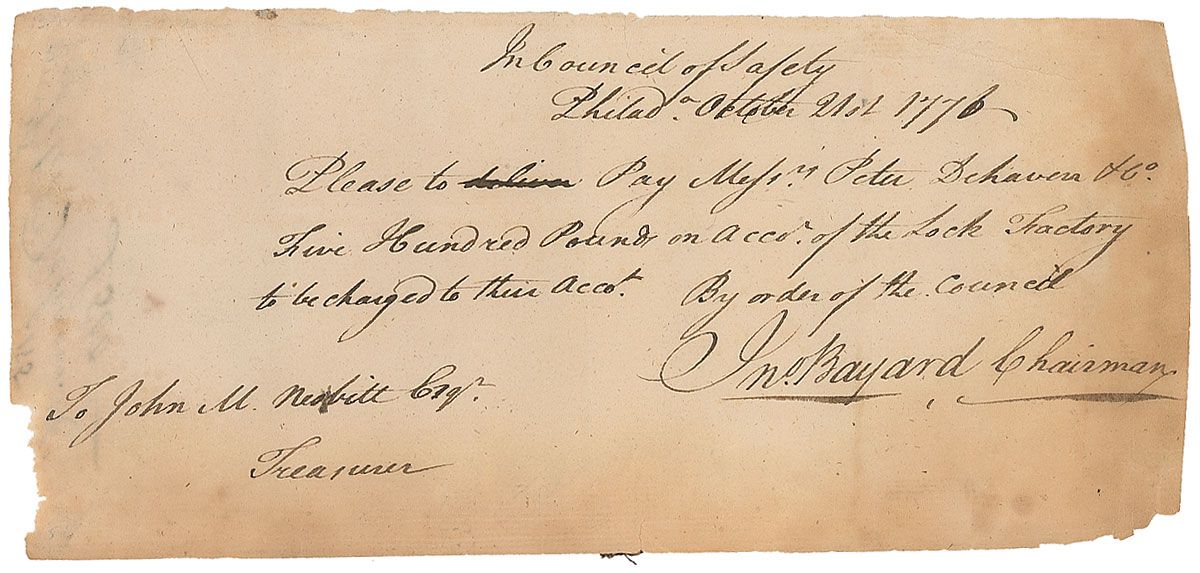 Merchant, soldier, and statesman from Philadelphia (1738–1807) who served as a delegate for Pennsylvania to the Continental Congress in 1785 and 1786. Revolutionary War–dated Manuscript DS, signed “Jno. Bayard, Chairman,” one page, 8.25 x 3.75, October 21, 1776. Philadelphia Council of Safety pay order. Bayard orders the treasurer to “Pay Mess’r Peter Dehaven & Co. Five Hundred Pounds on accot. of the Lock Factory to be charged to their accot.” In very good condition, with moderate toning to edges and a small repaired tear to upper right. Just a few months before signing this document, Bayard attended the meeting of the ‘Committee of Conference’ held in Carpenter’s Hall on June 18, 1776, which was the body that announced its willingness to ‘concur in a vote of the Congress’ to declare the independence of the colonies from British rule—within three weeks, the Declaration of Independence was signed.