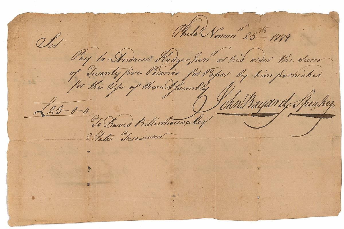 Merchant, soldier, statesman, and Speaker of the Pennsylvania Assembly (1738–1807) who served as a delegate to the Continental Congress in 1785 and 1786; he was cited by General Washington for his gallant leadership in the Battle of Princeton. Revolutionary War–dated manuscript DS, signed “John Bayard Speaker,” one page, 8 x 5, November 25, 1779. Pay order issued to State Treasurer David Rittenhouse. In full: “Pay to Andrew Hodge Junr. or his order the sum of Twenty five Pounds for Paper by him furnished for the use of the Assembly.” In very good condition, with intersecting folds (two vertical folds passing through letters of the signature), overall toning and scattered staining, and several pinholes along folds.