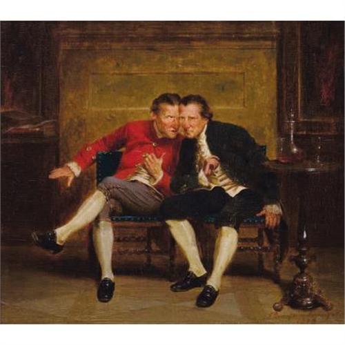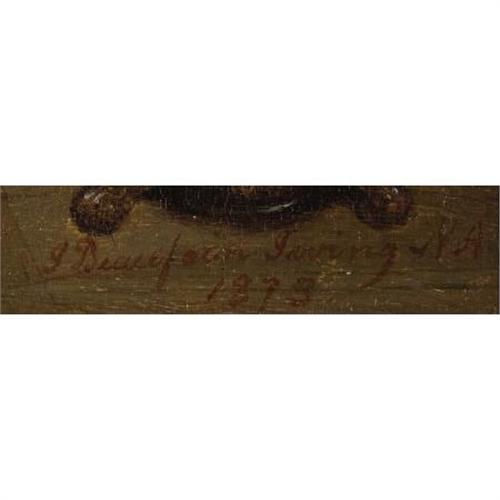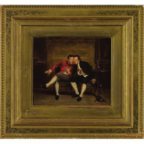 <B>JOHN BEAUFAIN IRVING (American, 1825-1877)</B></I><BR><I>The Gossips</B></I>, 1873<BR>Oil on panel<BR>7 x 8 inches (17.8 x 20.3 cm)<BR>Signed lower right: <I>J Beaufain Irving N A/1873</B></I><BR> <B>Condition Report:</B> Very minor craquelure throughout, some scattered inpainting, heavy varnishing.<BR><BR><b>Shipping:</b> Requires 3rd Party Shipping (<a target="_blank" href="http://www.heritageauctions.com/common/shipping.php">view shipping information</a>)