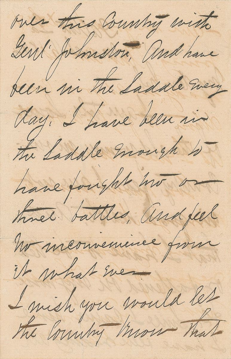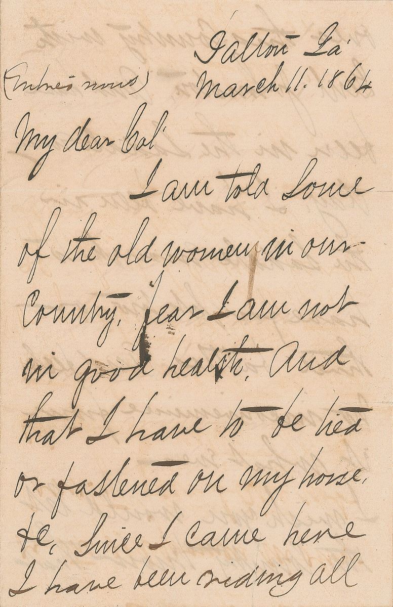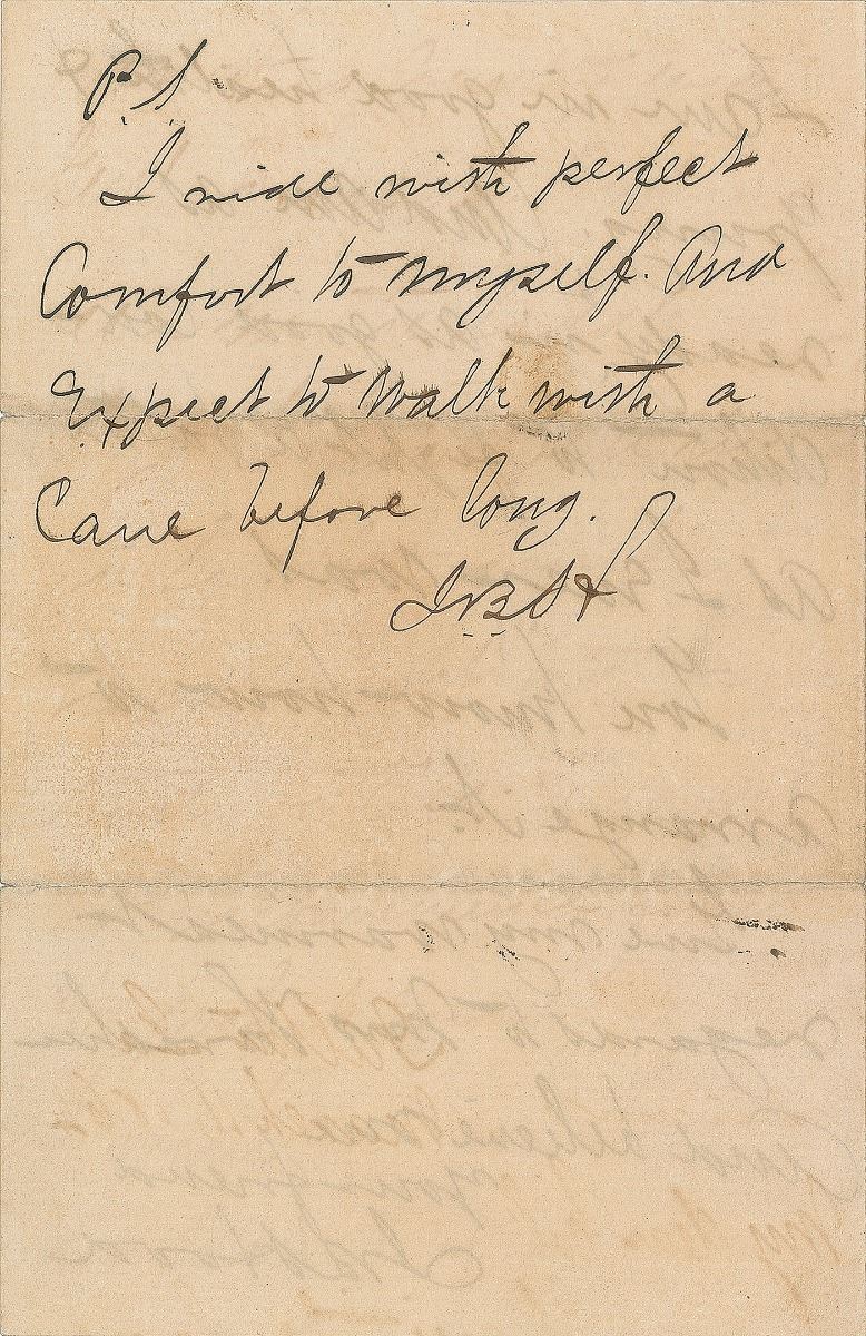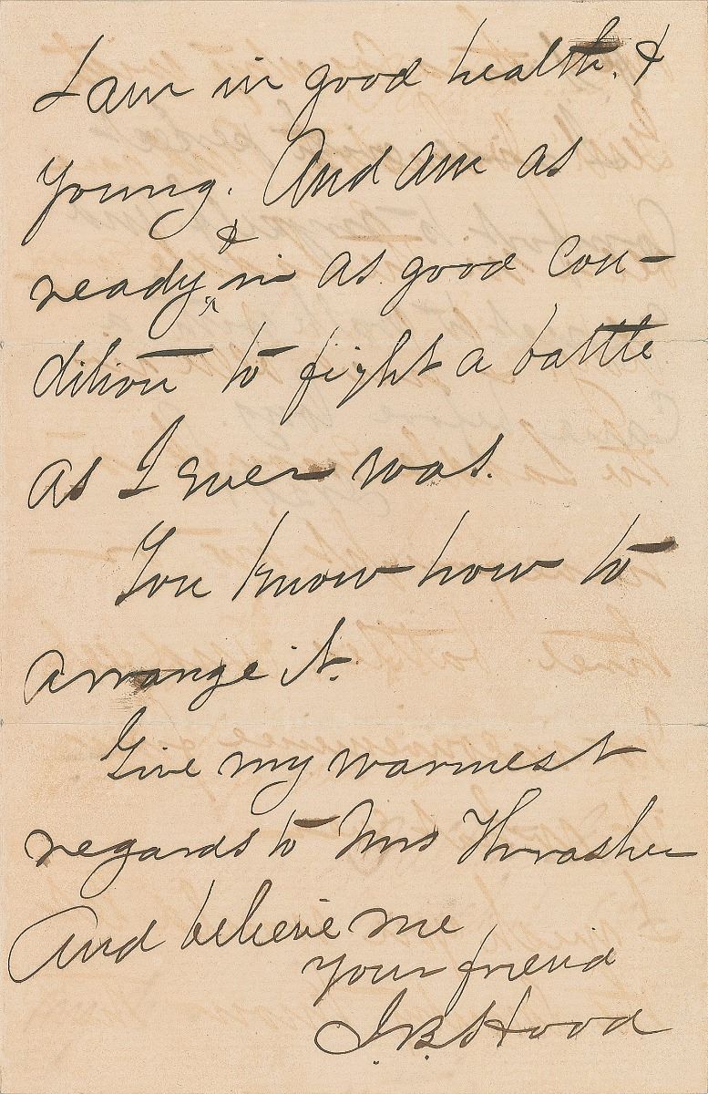 Civil War-dated ALS signed “J. B. Hood,” four pages on two adjoining sheets, 4.5 x 7, March 11, 1864. Written from Dalton, Georgia, a letter to a colonel, in full: “I am told some of the old women in our country fear I am not in good health. And that I have to be tied or fastened on my horse, etc. Since I came here I have been riding all over this country with Gen. Johnston. And have been in the saddle every day. I have been in the saddle enough to have fought two or three battles, and feel no inconvenience for it whatever. I wish you would let the country know that I am in good health & young. And am as ready & in as good condition to fight a battle as I ever was. You know how to arrange it. Give my warmest regards to Mrs. Thrasher.” Hood adds a brief postscript to the last page, signing with his initials, “J.B.H.,” in full: “I ride with perfect comfort to myself. And expect to walk with a cane before long.” In fine condition, with small splits along fold ends, an unobtrusive tear to the bottom edge, and writing show through from opposing sides.