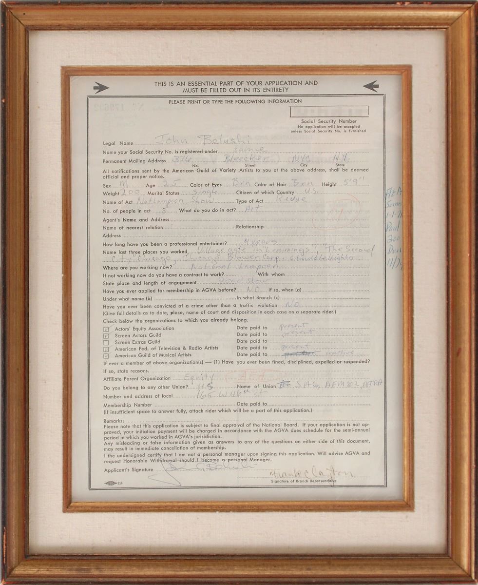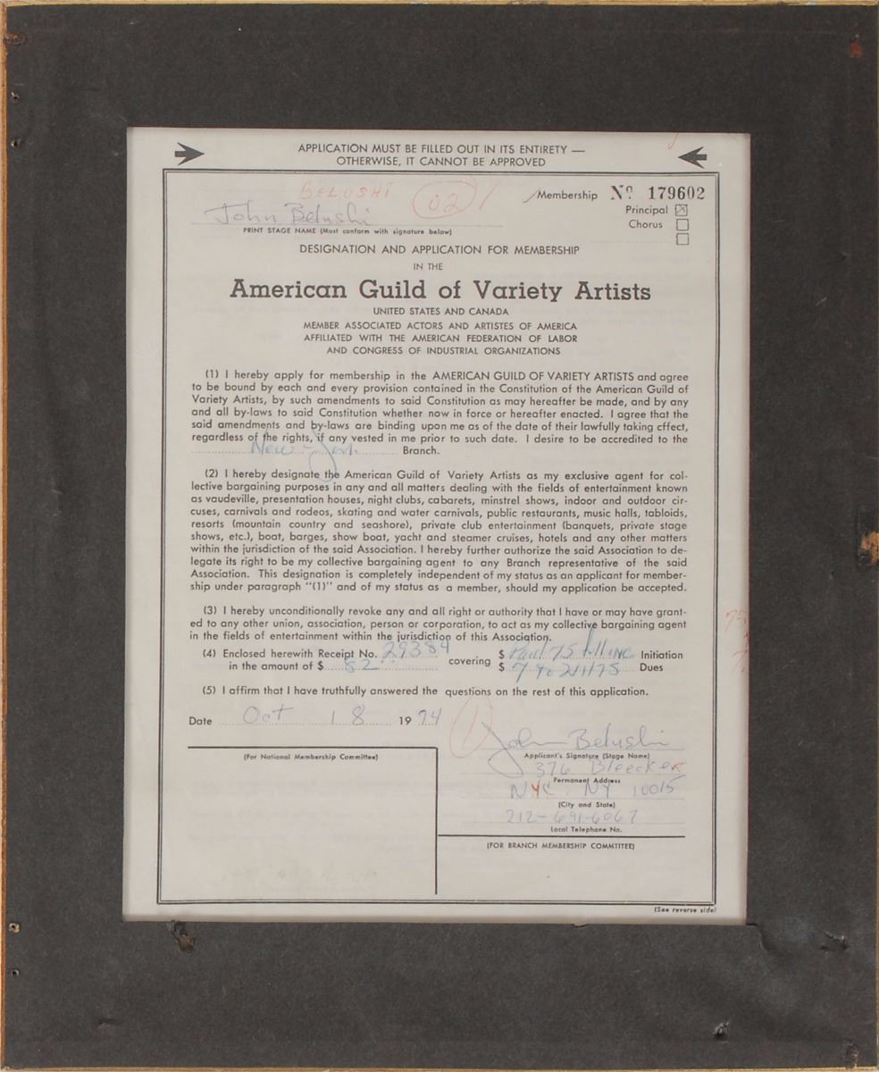 Partly-printed DS, signed “John Belushi,” one page both sides, 8.25 x 11, October 18, 1974. American Guild of Variety Artists application extensively filled out by Belushi with his personal and professional information. In addition to signing at the bottom of both sides, Belushi also writes his name in print at the top. He notes that the name of his act is “Nat. Lampoon Show,” and that the last three places he worked were “Village Gate in ‘Lemmings,’ ‘The Second City’ Chicago, Chicago Blower Corp.” Matted and framed with a glass backing for viewing the reverse. In fine condition. At this time Belushi was working on The National Lampoon Radio Hour, which also featured the likes of Chevy Chase, Bill Murray, John DeBella, Gilda Radner, and Harold Ramis. It was during a 1974 trip to Toronto to check the local Second City cast that he met Dan Aykroyd, with whom he would form the famed Blues Brothers partnership. A rarely seen, highly desirable piece from early in Belushi’s career.