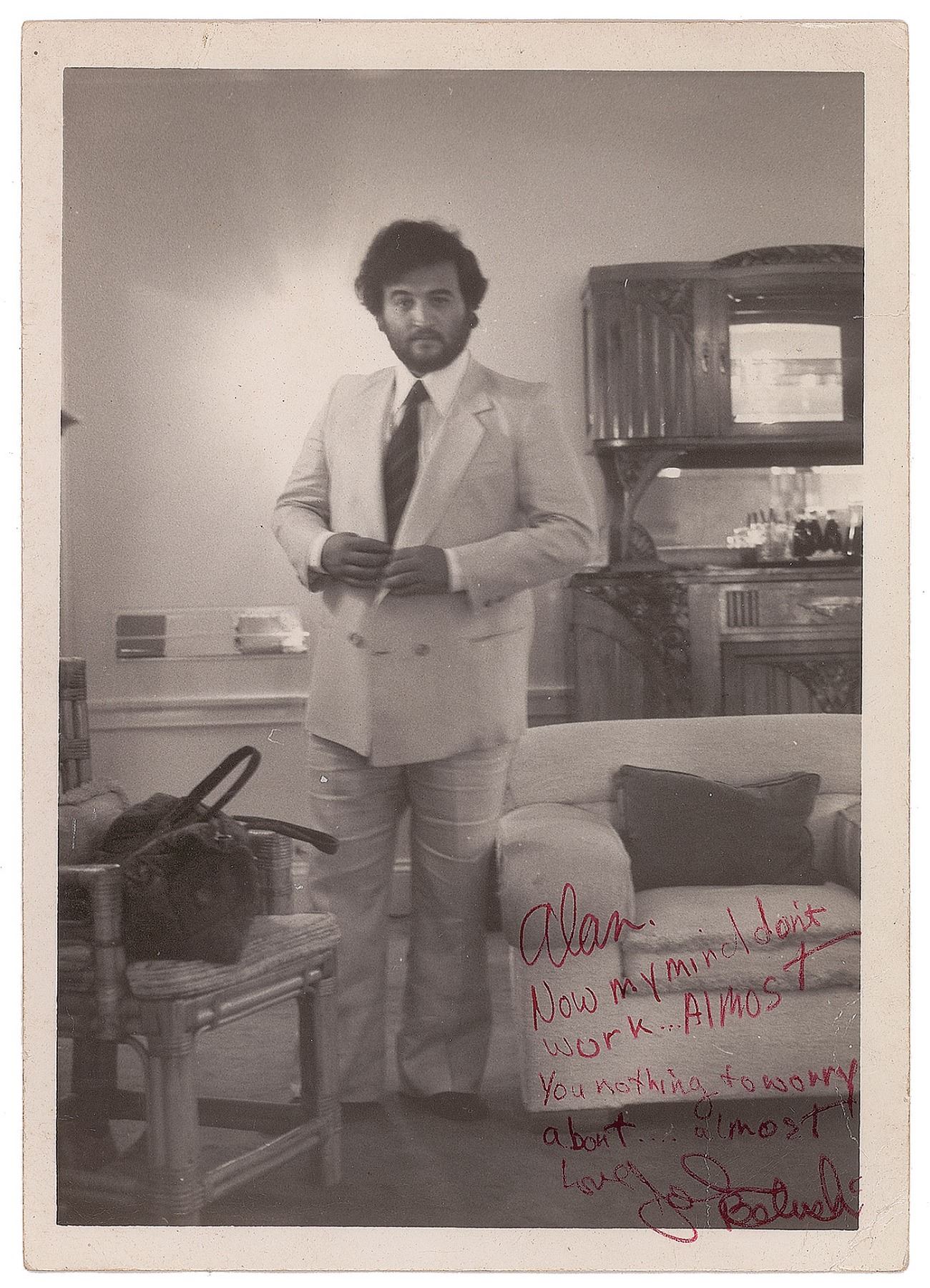 Desirable semi-glossy 5 x 7 full-length photo of Belushi wearing a light-colored suit, signed and inscribed in red ink, "Alan, Now my mind don't work…Almost, you nothing to worry about…almost, love, John Belushi.” In fine condition, with a light surface gouge to the upper left, and some light creasing to the signature area. The consignor notes that this was signed by Belushi for a close friend just a few weeks before his death. A wonderful photo of the late comedian, signed in bold red ink and picturing Belushi in a reserved, behind-the-scenes pose.