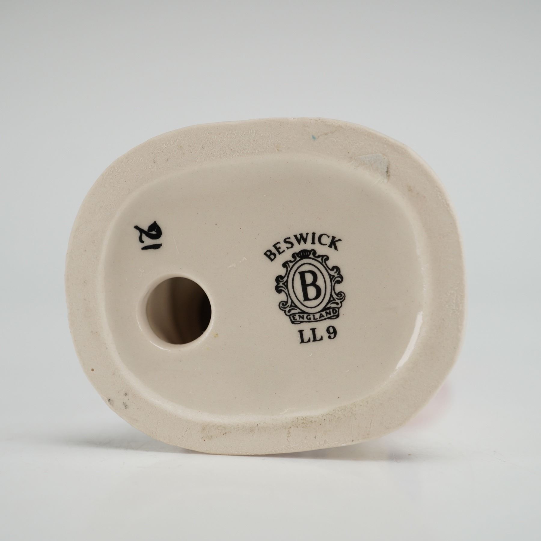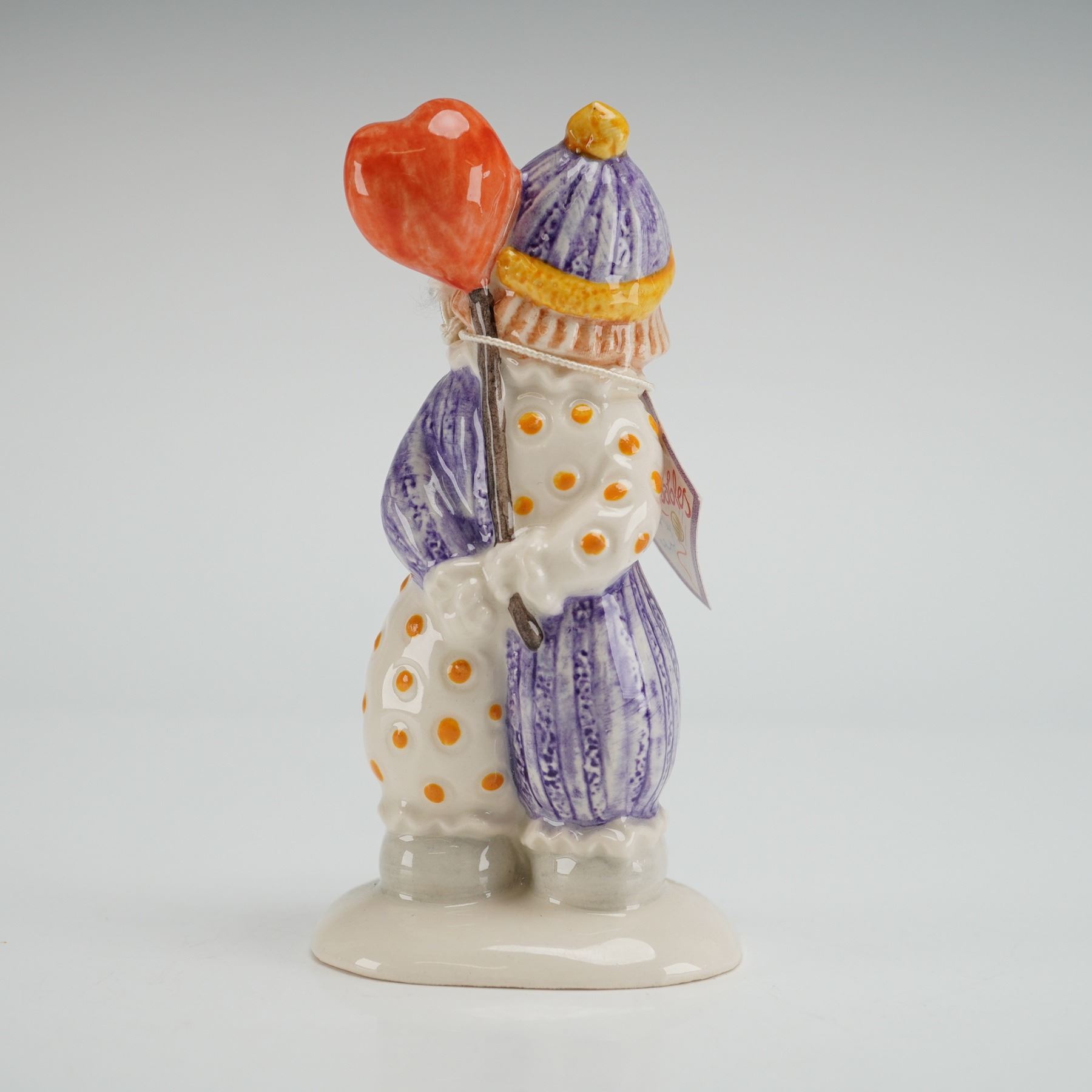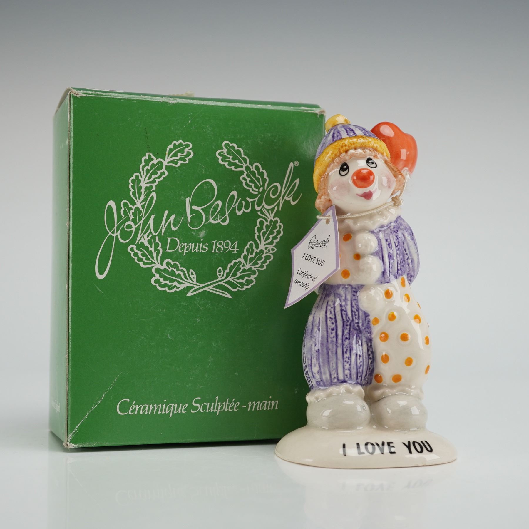 The piece features a whimsical clown in a tender pose, conveying a warm sentimental theme that is characteristic of Beswicks distinctive style. Finished in a smooth glazed surface with carefully applied colors, the figurine reflects the quality workmanship for which John Beswick ceramics are known. Markings on the underside identify the maker Beswick LL9 along with hang tag.