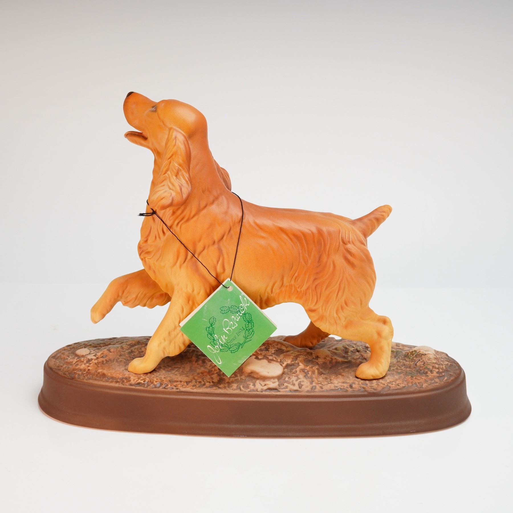 A John Beswick ceramic figurine of a spaniel. The dog is depicted in an alert, standing pose with one front paw raised, finished in a matte golden-brown glaze with detailed modeling of the coat and facial features. The figure is set upon a naturalistic, textured earth-toned base featuring an inset gold-tone plaque titled The Spaniel. This item retains its original green John Beswick Since 1894 hanging tag. Beswick backstamp.