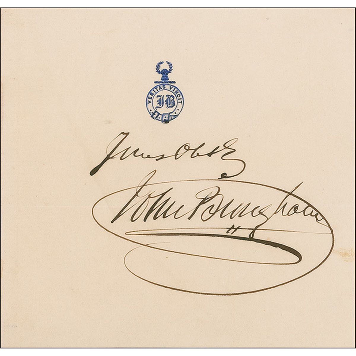Judge advocate in the trial of Abraham Lincoln’s assassination conspiracy and a persecutor in Andrew Johnson’s impeachment hearings. Ink signature on an off-white 4.75 x 4.5 sheet of personal letterhead. Scattered light creasing, a central horizontal mailing fold passing through the signature, a trivial spot of soiling, and trimmed edges, otherwise fine condition.