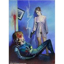 John Bolton - Original Painting for Mars Attacks Archives Card Set, "Woman Blasts Martian" (Topps, 1994). "Never wake a woman with a gun from a peaceful night's sleep" is the lesson we learn from this painting by the superb John Bolton. When Topps reissued their legendary Mars Attacks card set in 1994, they asked a handful of comic artists to contribute new cards for the set. This is one of the best of that new lot. Rendered in acrylics on textured paper, this piece measures approximately 11" x 15" and is signed by the artist in the lower left corner. Important notice: We expect to be auctioning lots at the rate of 200-250 per hour. Sometimes eBay Premier live bid software cannot keep up with that pace, so we strongly recommend that you place a realistic proxy bid now as insurance to avoid disappointment. Also please note that all Heritage/CAA lots purchased through eBay Premier carry a 20% Buyer's Premium. Please make sure you read the Terms and Conditions.