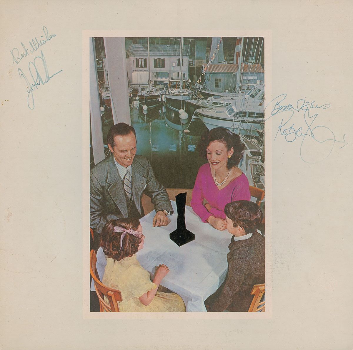 Presence album signed on the front cover in felt tip, "Best wishes, John Bonham" and "Best wishes, Robert Plant." Some scattered marks and soiling, slight irregular adhesion to signatures, and an easily repaired split to the bottom edge, otherwise fine condition. The record is not included. An infrequently seen signed album and an especially attractive piece as they signed in the white borders.