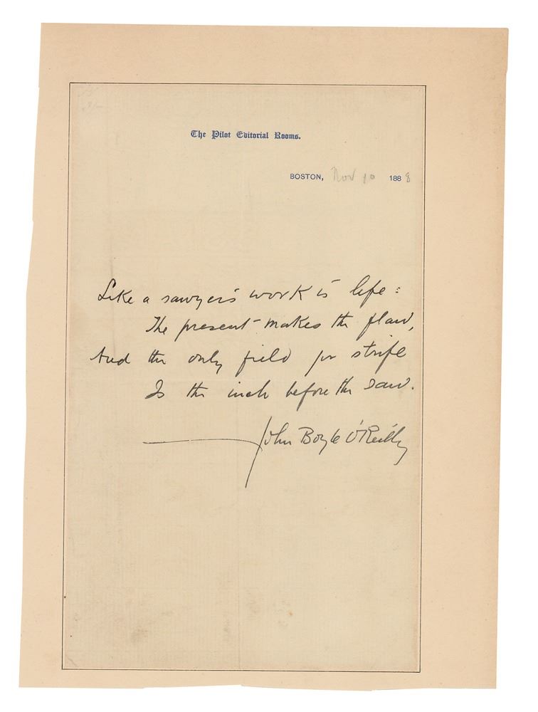 AQS on an off-white 5.5 x 9 sheet of "The Pilot Editorial Rooms" letterhead, signed at the conclusion in ink, "John Boyle O'Reilly." O'Reilly pens a poetic verse, in full: "Like a sawyer's work is life: / The present makes the flaw, / And the only field for strife / Is the inch before the saw." Professionally inlaid into a larger sheet and in fine condition.