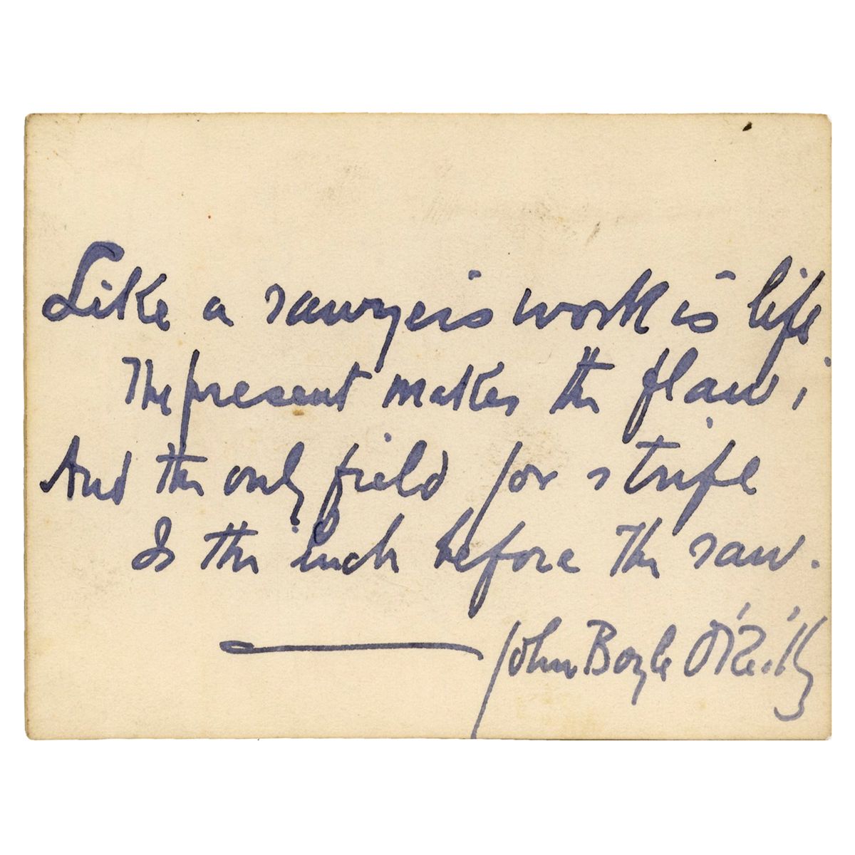 Handwritten poem signed by John Boyle O'Reilly, renowned 19th century Irish-American poet and editor of the Boston newspaper ''The Pilot.'' Inked in blue, poem reads in full, ''Like a sawyer's work is life / The present makes the flaw; And the only field for strife / is the inch before the saw. John Boyle O'Reilly''. Measures 4.5'' x 3.5''. Toning, else near fine.