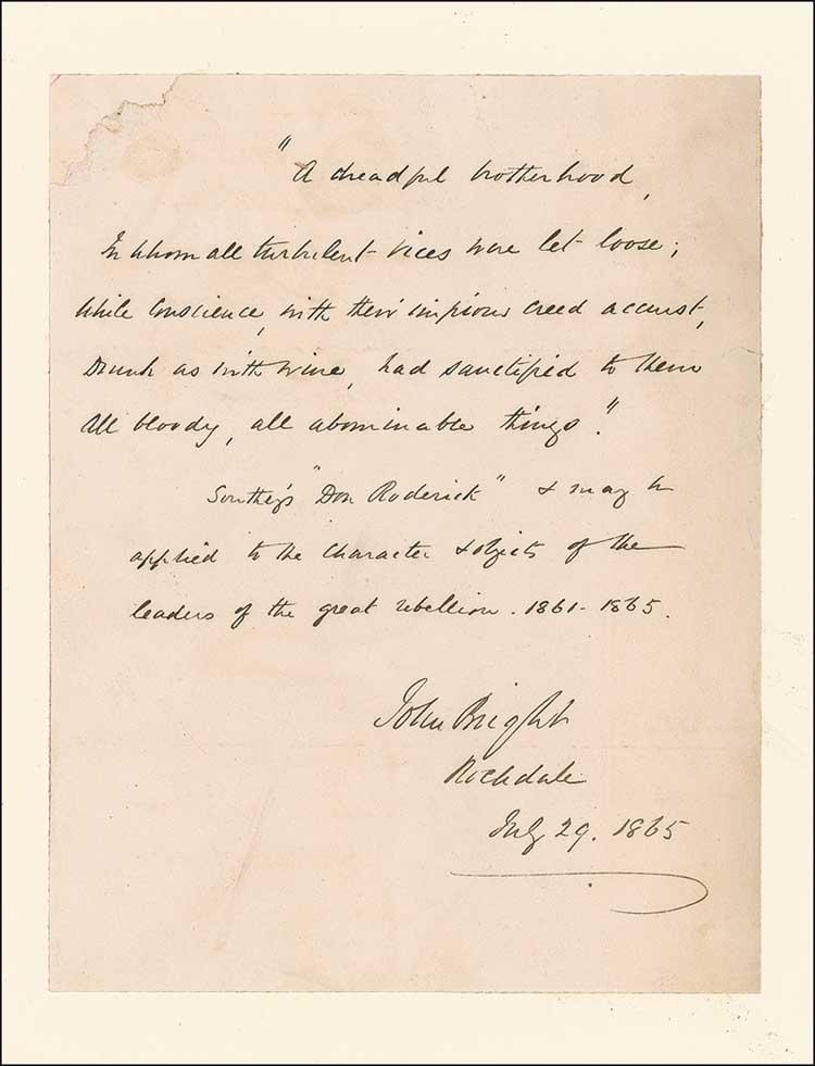 English orator and statesman. AQS on a 4.5 x 5.75 off-white sheet, Bright writes a quote from Robert Southey’s Roderick, last of the Goths. In full: “A dreadful brotherhood, in whom all turbulent vices were let loose; While Conscience, with their impious creed accurst; Drunk as with wine, had sanctified to them; All bloody, all abominable things.” Underneath, Bright adds, “Southey’s Don Roderick & may be applied to the chaotic subjects of the leaders of the great rebellion 1861-1865,” and signed at the bottom, “John Bright, Richdale, July 29, 1865.” Page is affixed to a slightly larger sheet. In fine condition, with repair to paper loss at top left corner, a few creases, and some scattered light soiling. RRAuction COA.