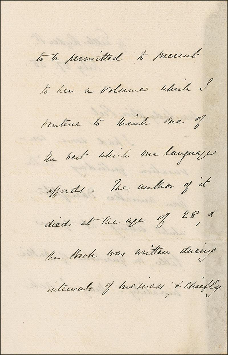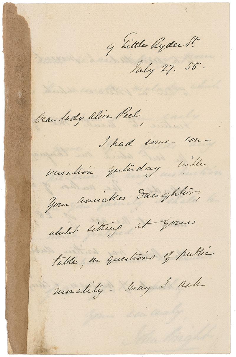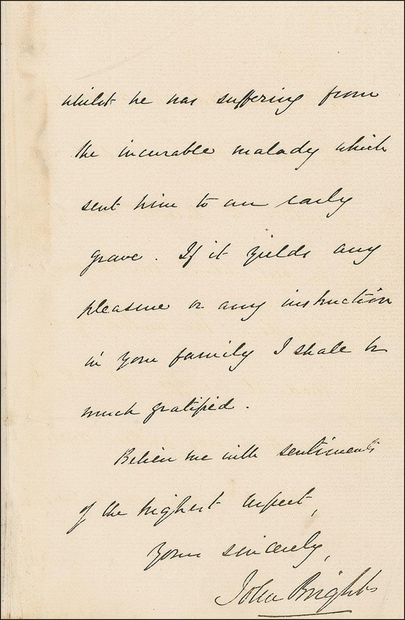 ALS, three pages on two adjoining sheets, 4.5 x 7, July 27, 1856. Bright writes to Lady Alice Peel, daughter of Sir Robert Peel, the former prime minister. In part, “I had some conversation yesterday with your amiable Daughter, while sitting at your table on questions of public morality. May I ask to be permitted to present to her a volume which I venture to think one of the best which our language affords. The author of it died at the age of 28, & the book was written…chiefly whilst he was suffering from the incurable malady which sent him to an early grave.” In very good condition, with light soiling, scattered creasing and wrinkling, and a mounting strip along the left edge of the first page (away from the text with light traces on the reverse and adjoining page). RRAuction COA.