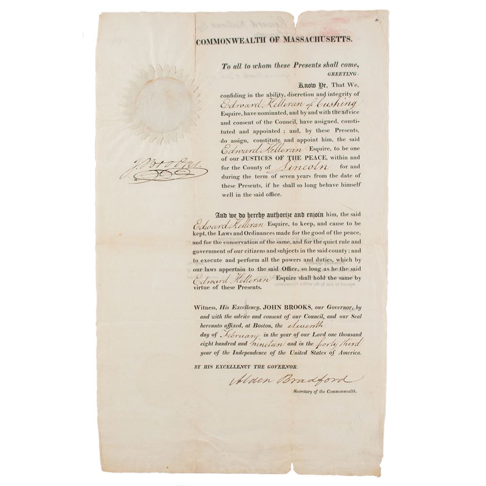 Partly-printed DS, signed ‰ÛÏJ. Brooks,‰Û one page, 10 x 15.75, February 11, 1819. As governor of Massachusetts, Brooks appoints Edward Kelleran "to be one of our Justices of the Peace, within and for the County of Lincoln." Signed in the upper left by Governor Brooks, and countersigned at the conclusion by Secretary of the Commonwealth Alden Bradford. The white paper seal affixed to the upper left remains intact. In very good to fine condition, with minor edge losses and partial splits to folds.