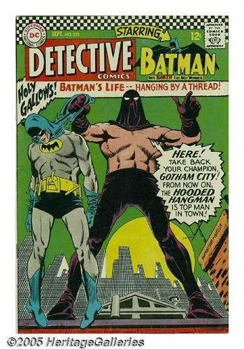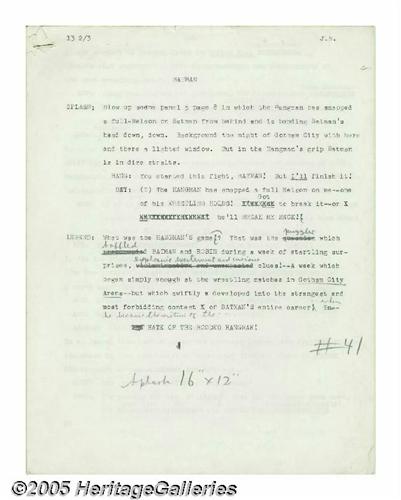 <B>John Broome - Original Script for Detective Comics #355 (1966).</B></I> This is John Broome's original script for this Silver Age issue, which featured Batman battling the Hangman. The entire story is here, on sixteen typewritten pages with many handwritten corrections in pencil. In a couple of cases, Broome provided diagrams suggesting a panel arrangement to artist Carmine Infantino. A copy of the comic book is included with this lot.