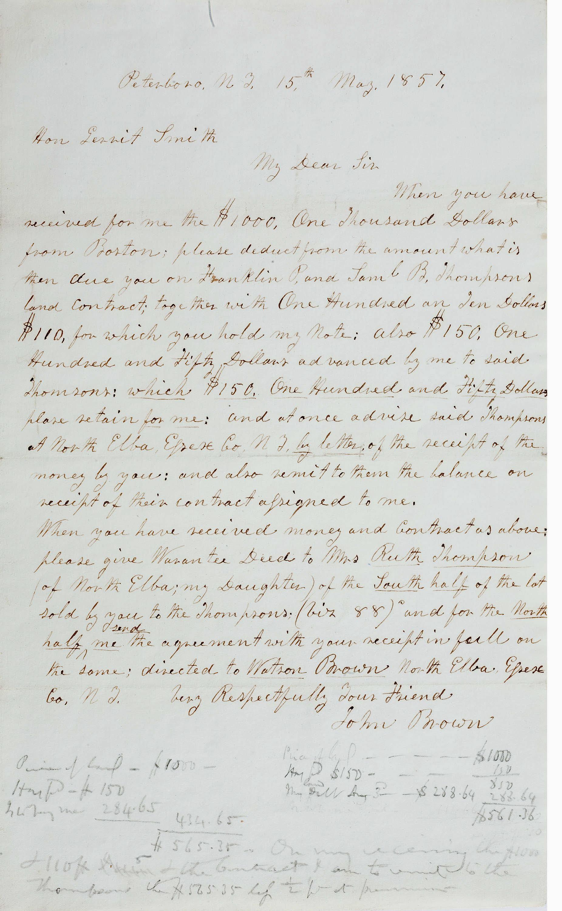 Historically important autograph letter signed by John Brown, written to Gerrit Smith, one of the key financial backers of Brown's attempt to seize the U.S. Arsenal at Harper's Ferry. Dated 15 May 1857 from Peterborough, New Hampshire, Brown asks Smith to coordinate the transfer of money. In part: ''When you have received for me the $1,000...from Boston, please deduct from the amount of what is then due you on Franklin P. and Saml. B. Thompson's land contract; together with One Hundred and ten Dollars...for which you hold on my note; also $150...advanced by me to said Thom[p]sons; which $150...please retain for me; and at once advise said Thompsons at North Elba, Essex Co., N.Y., by letter, of the receipt of the money by you; and also remit to them the balance on receipt of their contract assigned to me. When you have received money and Contract as above: please give Warrantee Deed to Mrs Ruth Thompson (of North Elba; my Daughter) of the south half of the lot sold by you to the Thompsons.'' Brown had originally acquired the above lot from Smith in 1854, intending to live in the free black community that was created there by Smith. Before he moved, however, he was called away to assist the anti-slavery fighters in Kansas, a decision that turned his protests markedly violent. He soon participated in a series of brutal attacks and counter-attacks in which he killed five pro-slavery men at Potawatomie Creek in May 1856. As a result, Brown and his sons were expelled from Kansas. After this, acquaintances were struck by the fanaticism of his appearance and obsession with slavery. Both Brown and Smith became impatient with the slow progress of abolitionism. Smith provided money for the cause, contributing $16,000 to purchase guns in Kansas and funding Brown's raid at Harper's Ferry in 1859. After Brown's raid failed, Smith denied his connections to Brown and burned many of his incriminating documents, making this a rare example of an extant letter from Brown to co-conspirator Smith, specifically discussing money transfers. Single page measures 7.75'' x 12.75''. Penciled notations in the lower margin appear to be those of Smith and contain figures mentioned in Brown's letter. In very good condition with fold separations professionally repaired.