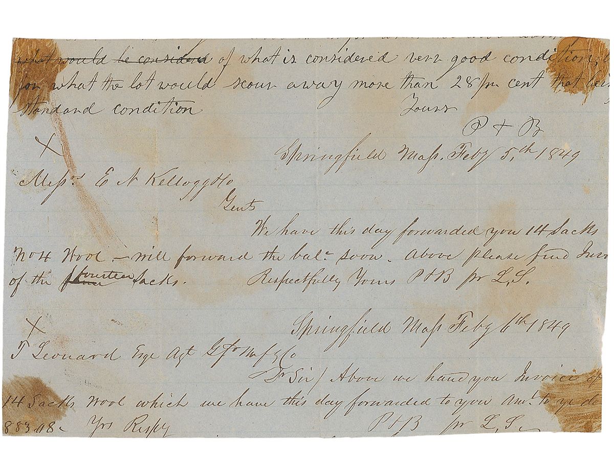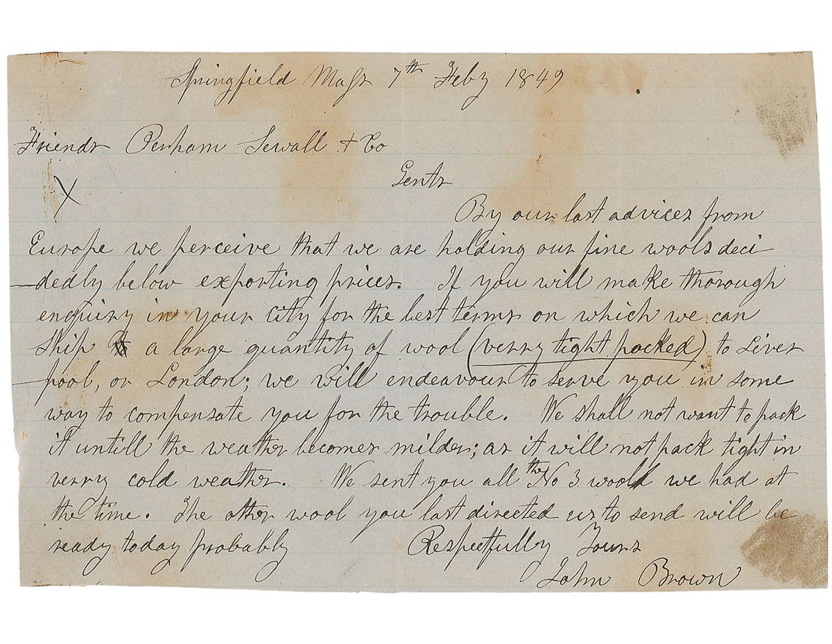 At this time, Brown was in Springfield, Massachusetts, where he had set up an office in 1846 for his wool business, begun with Simon Perkins. Although Brown was adept at raising sheep and sorting, grading, and preparing wool for sale, he was a poor businessman and continually failed to sell his wool at the price he desired. He believed that he could get better prices abroad, and in August 1849 he sailed to England with 200,000 pounds of wool—this letter, written six months earlier, demonstrates his belief that his product would be more valuable abroad and anticipates his August voyage, which would end in utter failure. His wool was poorly received in Great Britain—not because of its quality, but because Englishmen believed it impossible to raise good wool in America, stubbornly refusing to pay him well for it. After two months of failure, Brown lamented 'I have a great deal of stupid obstinate prejudice to contend with, as well as conflicting interests both in this country and abroad.' Ultimately, Brown was forced to sell the wool at 50% below the value he could have gotten in America, and returned home.