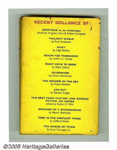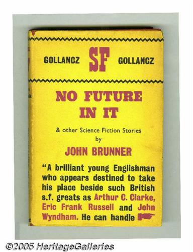 <B>John Brunner - No Future In It with Dust Jacket (Victor Gollancz Ltd., 1962).</B></I> A brilliant selection of eleven exceptional and unusual science fiction short stories from the pen of a John Brunner, who has taken his place beside such British science-fiction greats as Arthur C. Clarke, Eric Frank Russell, and John Wyndham. Hardcover. Light to moderate reading and edge wear. The contents are clean and bright. The dust jacket has some tanning along the edges, but the red cloth hardcovers have only minor edge wear. The frontispiece has been stamped by a store. A sound older copy.